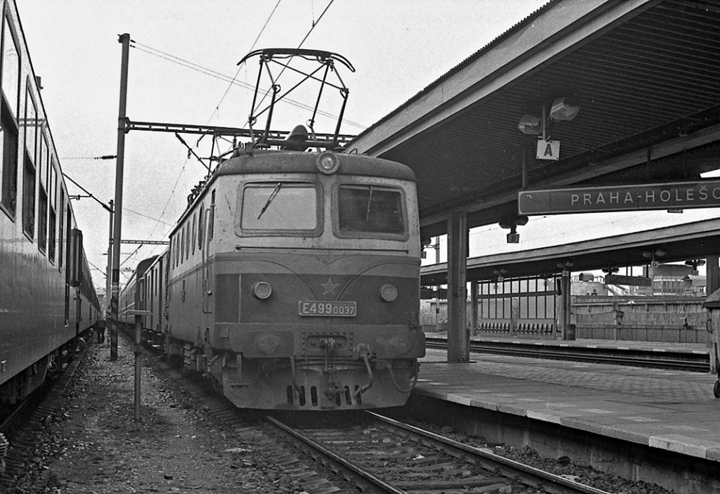 V čele rychlíku «Vltava» do Moskvy se objevila 1 března 1990 «Bobina» E499.0037. Na snímku ji vidíme ve stanici Praha-Holešovice (01.03.1990).