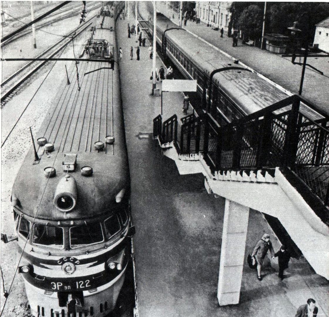 Электропоезд ЭР9П-122 у платформы железнодорожного вокзала Борисов, Минская область (фото сделано в 1977 - 1978 годах):