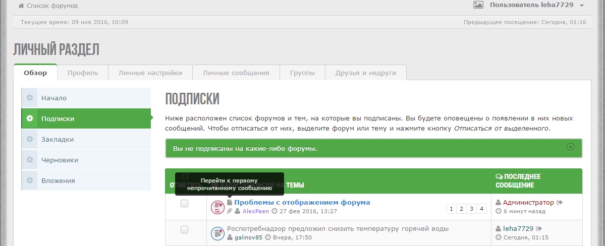 Можно сделать так, чтобы перечень подписок открывался одним кликом на пункт всплывающего меню имени пользователя в правом верхнем углу? Сейчас можно открыть только первый пункт Личного раздела - Начало (с данными о влиянии на репутацию, дате регистрации, количестве сообщений), и только потом выбирать второй пункт - Подписки.
