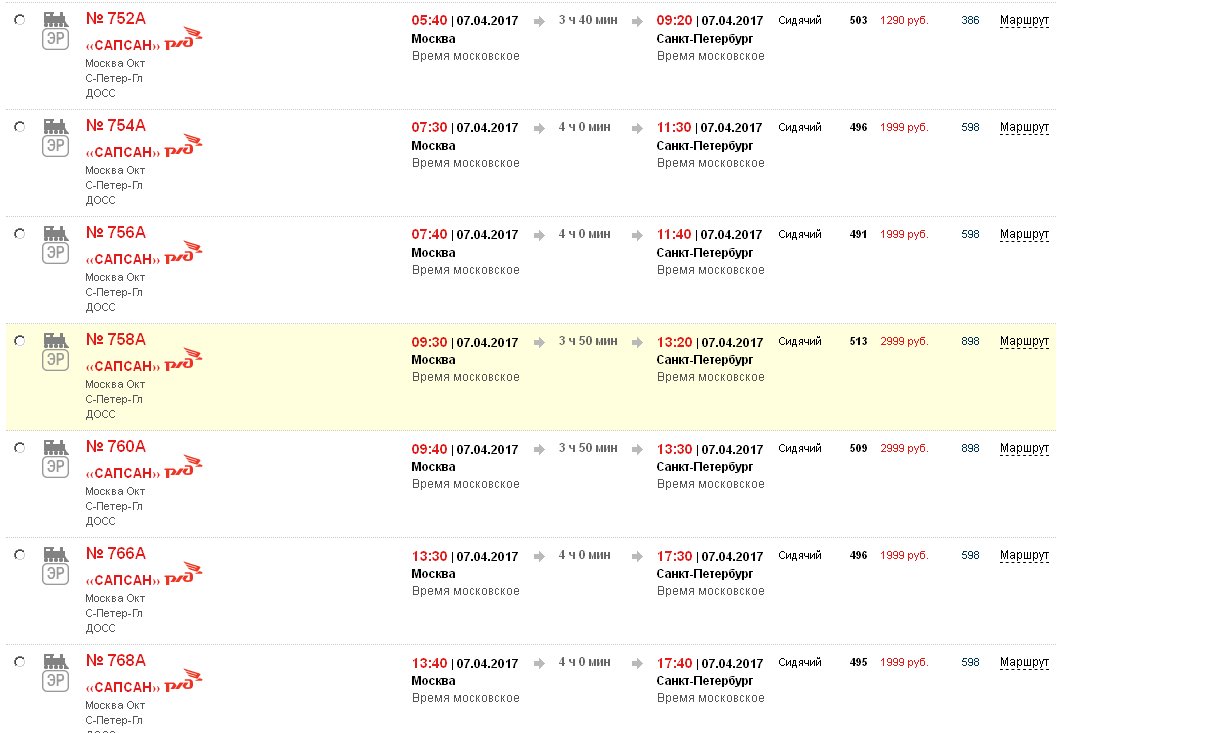 Сегодняшние попытки как минимум двух человек с нашего форума взять билеты по 999 руб на 9-часовые утренние "Сапсаны" (один пытался взять из Москвы на 9.30/9.40, другой - из Петербурга на 9.00) показали, что у этих рейсов какое-то особое ценообразование, и взять 999 на эти рейсы практически нереально. Вообще. Цена улетает в 2999 сразу же и при бОльшем количестве мест, чем на соседние рейсы. На 7.30/7.40 из Москвы сегодня было 490-480 мест, и при этом цена была 1225 долгое время. Но на 9.30/9.40 при 513 местах почему-то цена 2999. Хотелось бы узнать, действительно ли у 9-часовых рейсов какие-то особые коэффициенты. И было бы правильным объявить, что на эти рейсы ценЫ 999 больше нет. Так было бы честнее со стороны РЖД, дабы не вводить пассажиров в заблуждение.