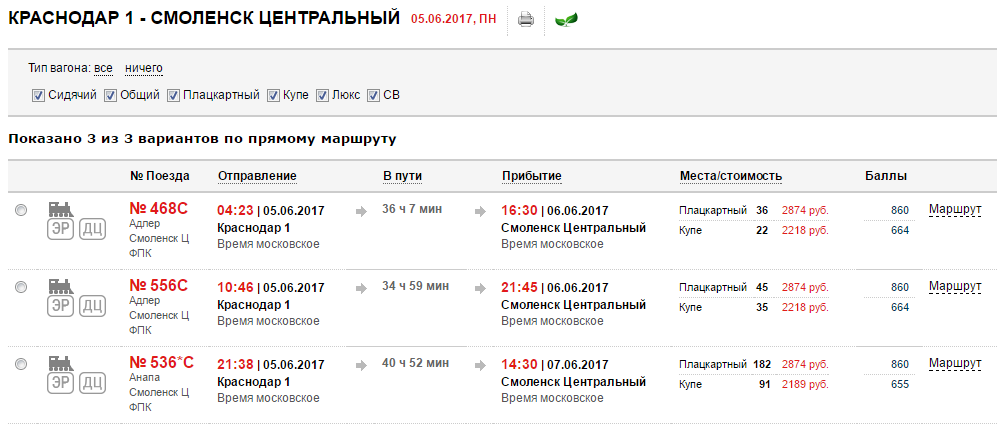 Но при этом цена постоянная была до этой скидки что на нижние, что на верхние поезда на Смоленск-Брянск-Адлер/Анапа.qoymeck: Наблюдается. Вот, например, все три смоленских поезда на 05.06 от Краснодара: на 468С и 556С цена в купе верх/низ — 2218,50/4289,00, на 536С — 2189,20/4230,20.