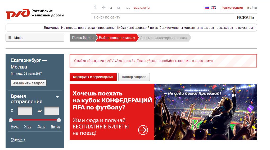 Лежит, однако. Точнее, сам сайт работает, а вот билеты не взять. Мобильное приложение тоже упало.