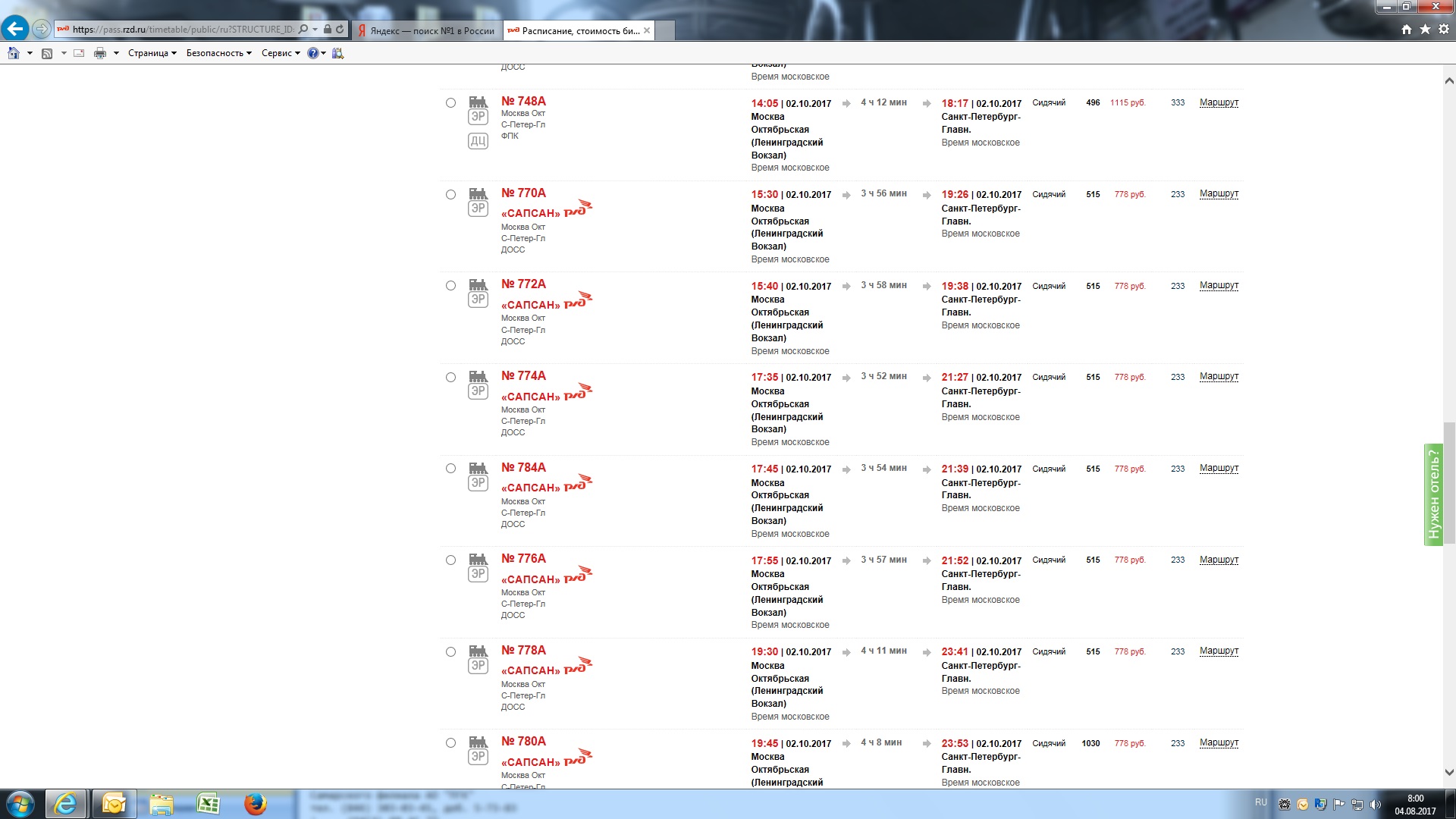 отпр из Москвы Окт с 04/10 – 17 г ежедневно в 21.00, Тверь 22.03-22.04, приб в СПб Гл с 05/10 – 17 г. ежедневно в 00.42.