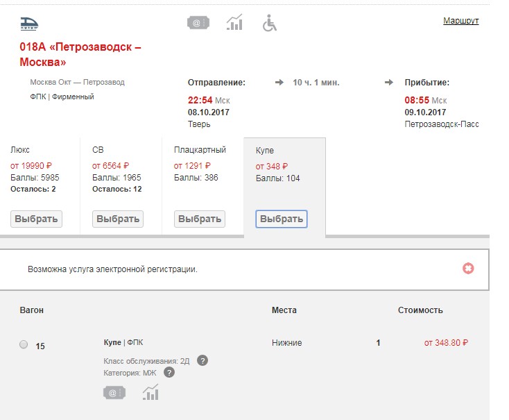 Сейчас в продаже есть одно женское место от Москвы до Петрозаводска на 08.10. Можно купить только от Москвы или от Твери до Петрозаводска, все остальные маршруты нельзя