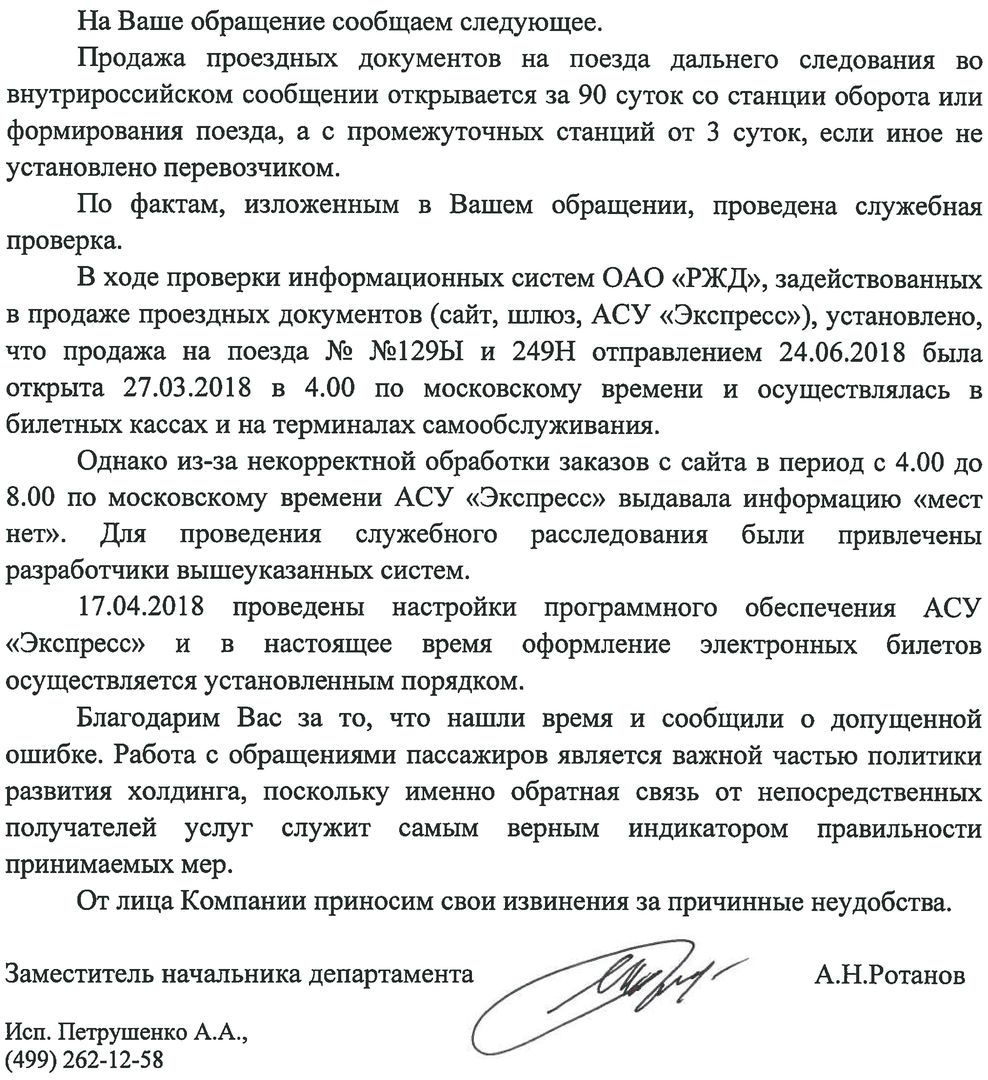 Alf » 30-03-2018, 12:30:Я 18 марта покупал билеты на 15 июня, т.е. в первый день продаж на 243 поезд от Новосибирска до Тихорецкой. Купил в 8:00 утра, все было норм. А с 26 марта начались проблемы, продажи открываются в 12:00 т.е 8:00 МСК, но на яндексе открыты продажи как и было раньше, в 8:00 по НСК. Но там комиссия, не хочу переплачивать..