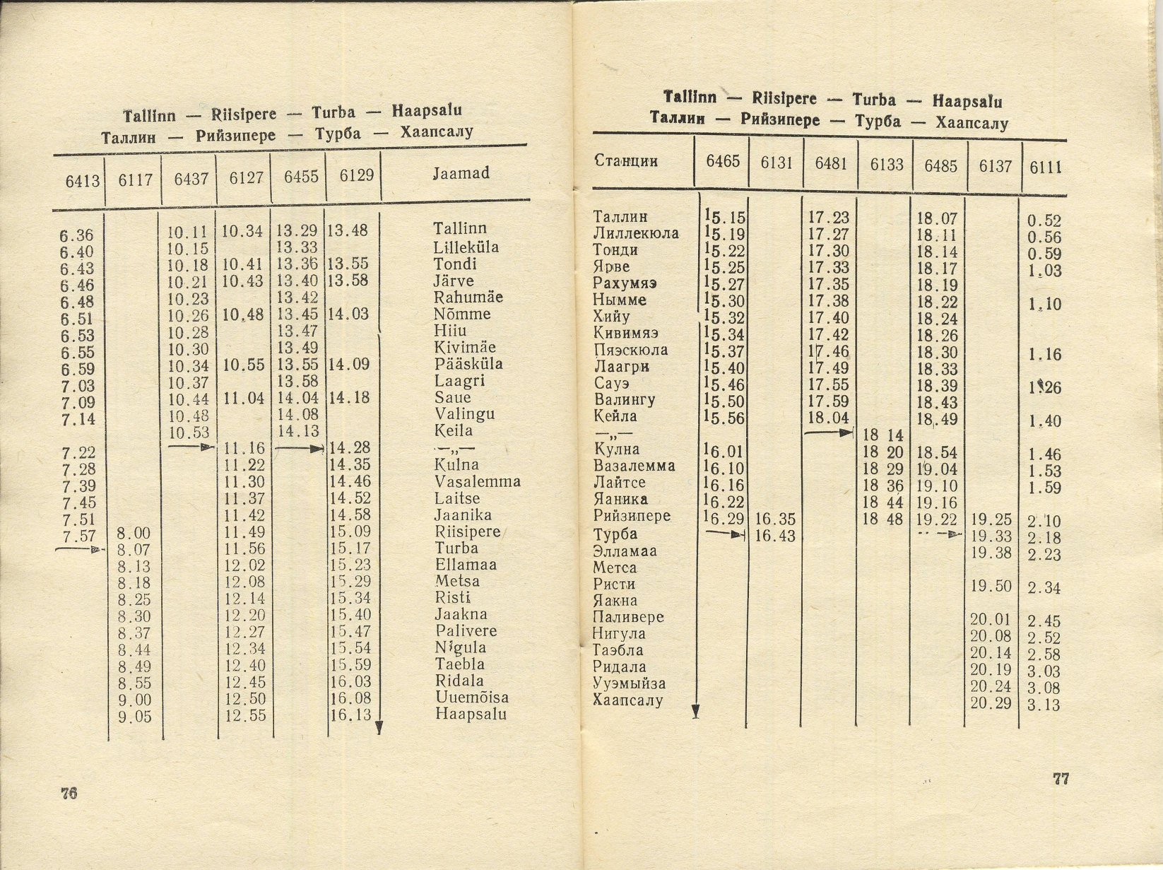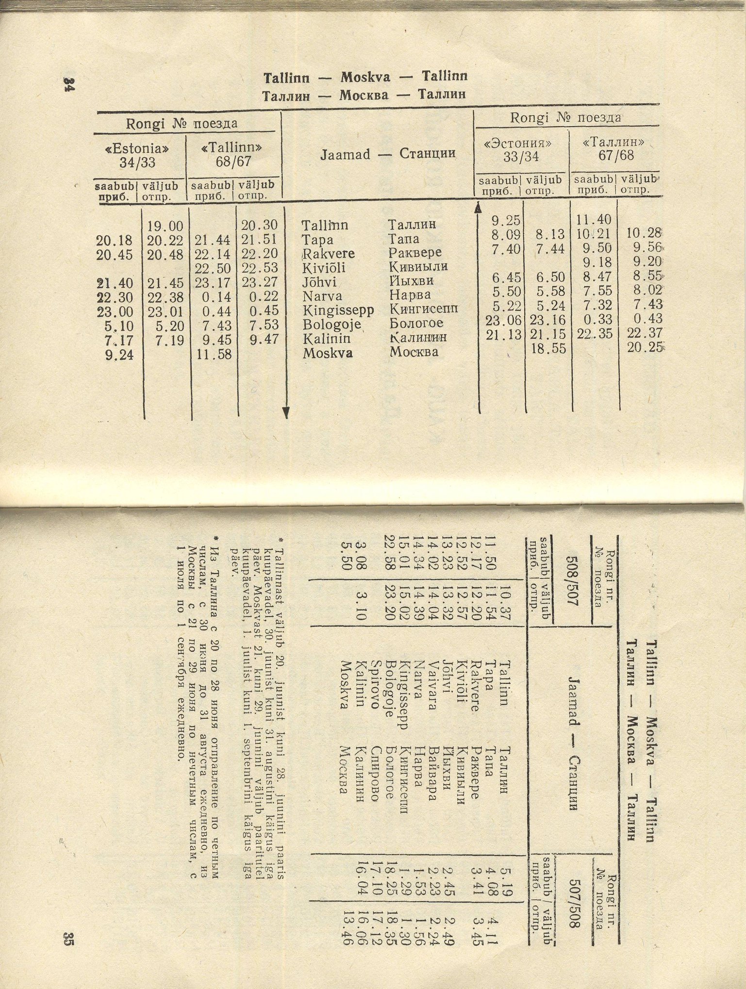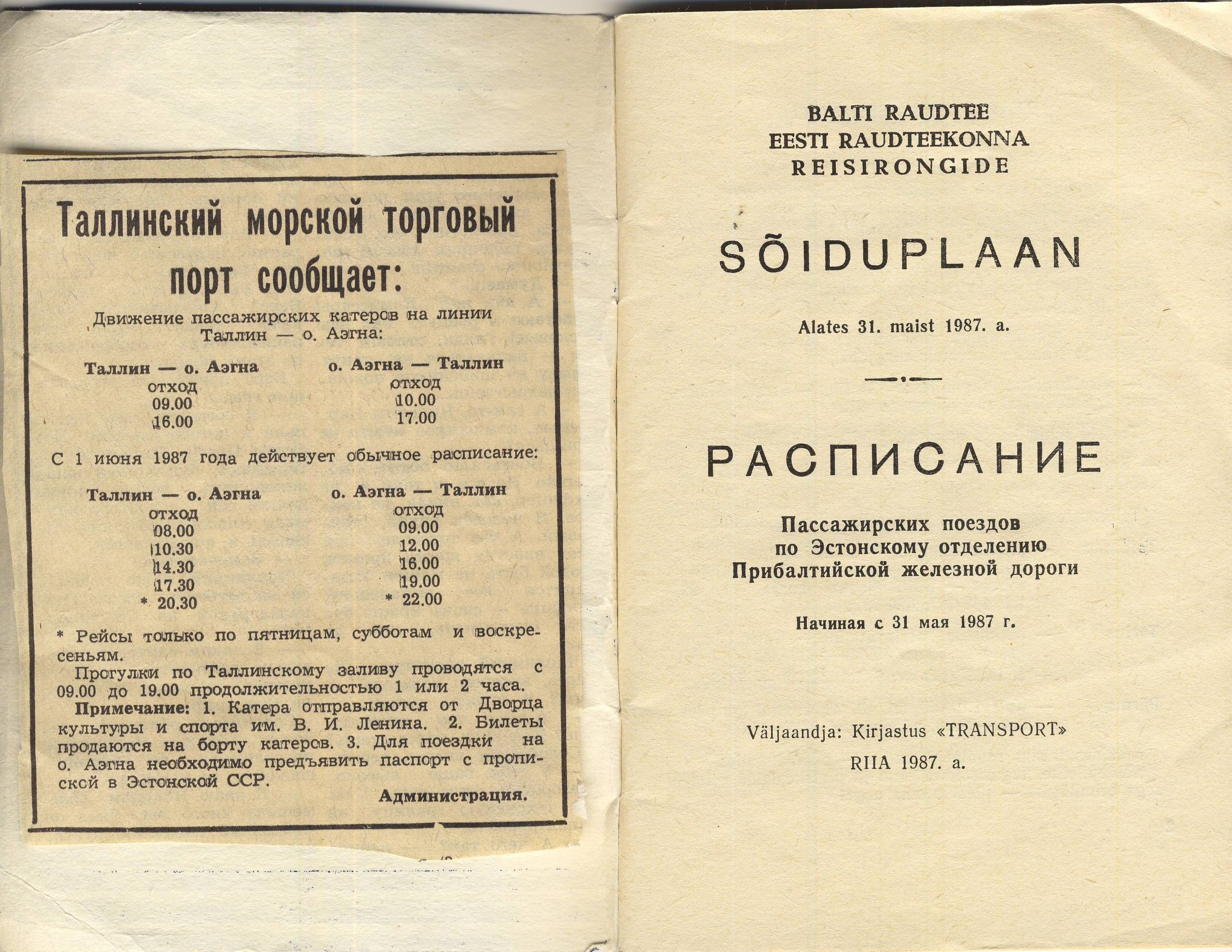 Расписание пассажирских поездов по Эстонскому отделению Прибалтийской железной дороги 1987 г Был поезд "Чайка" до Минска. Можно было доехать по железной дороге без пересадки в Брест, Харьков, Сочи и Симферополь. Внутри железнодорожного расписания оказалось вклеенное расписание катеров на Аэгна, тогда они отправлялись от "Дворца культуры и спорта им.Ленина", и для поездки нужно было иметь прописку в Эстонской ССР.