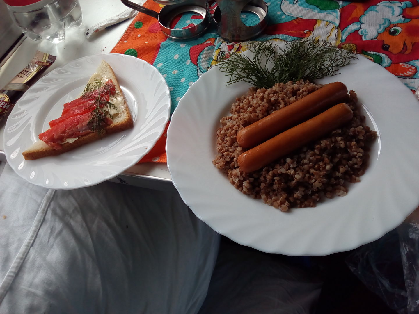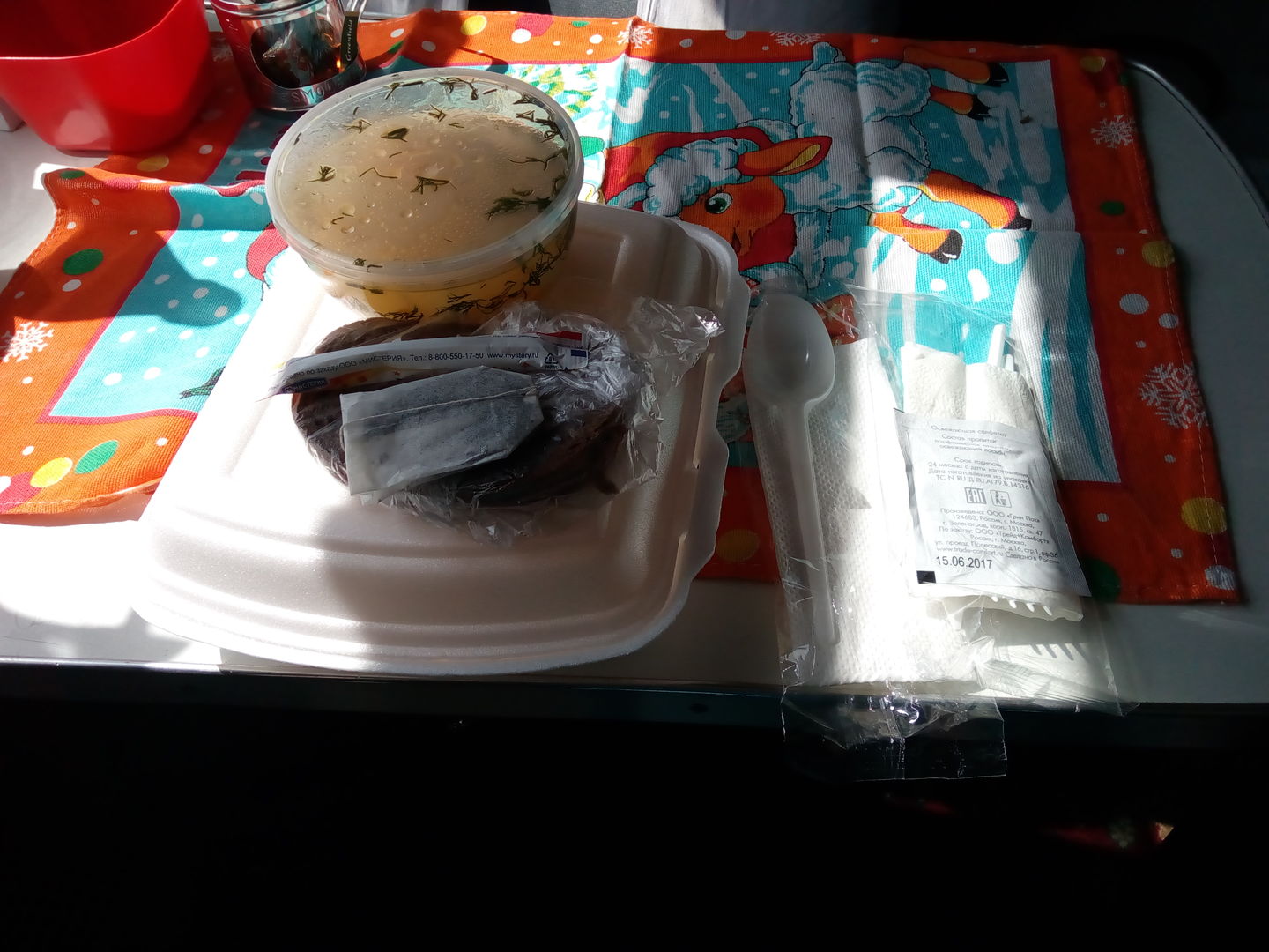 В первый день еду приносили в одноразовой посуде, к каждому приёму пищи прилагались одноразовые столовые приборы, соль, перец, салфетки обычная и влажная, пакетик чая, сахар, 2 куска свежего хлеба. На второй день похоже всё это закончилось, и выдавали только хлеб, который был другой и значительно худшего качества, и растворимый кофе. Посуда и столовые приборы во второй день были обычные. В остальном во второй день еда была такая же вкусная, как и в первый.