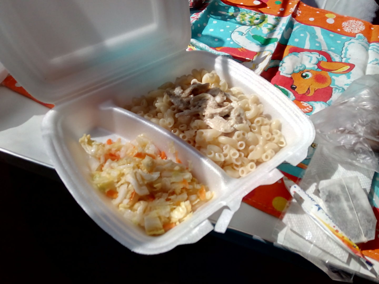 В первый день еду приносили в одноразовой посуде, к каждому приёму пищи прилагались одноразовые столовые приборы, соль, перец, салфетки обычная и влажная, пакетик чая, сахар, 2 куска свежего хлеба. На второй день похоже всё это закончилось, и выдавали только хлеб, который был другой и значительно худшего качества, и растворимый кофе. Посуда и столовые приборы во второй день были обычные. В остальном во второй день еда была такая же вкусная, как и в первый.