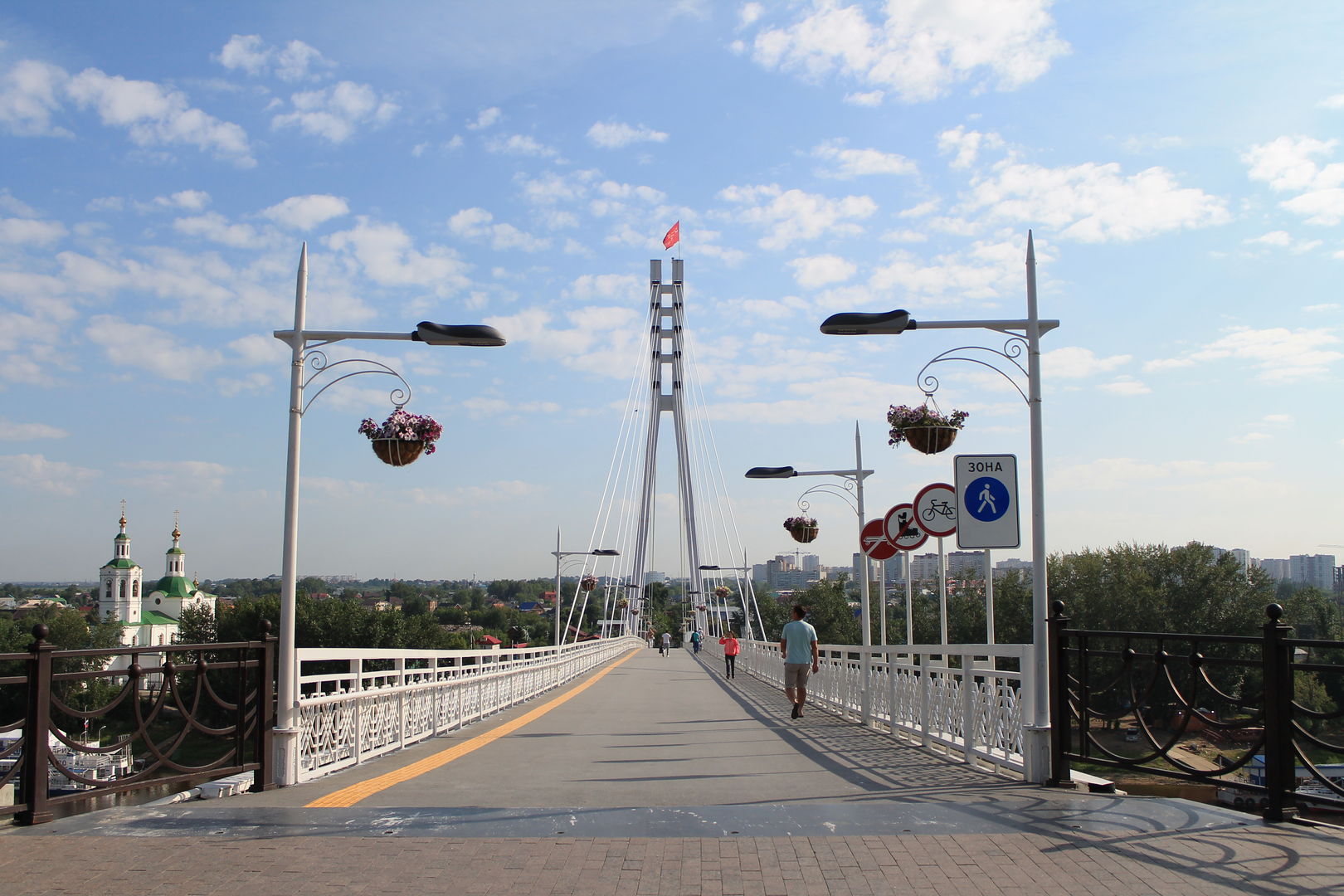 Пешеходный вантовый мост через реку Туру был построен в 1987 году на месте деревянного моста, который рухнул в 1982 году.