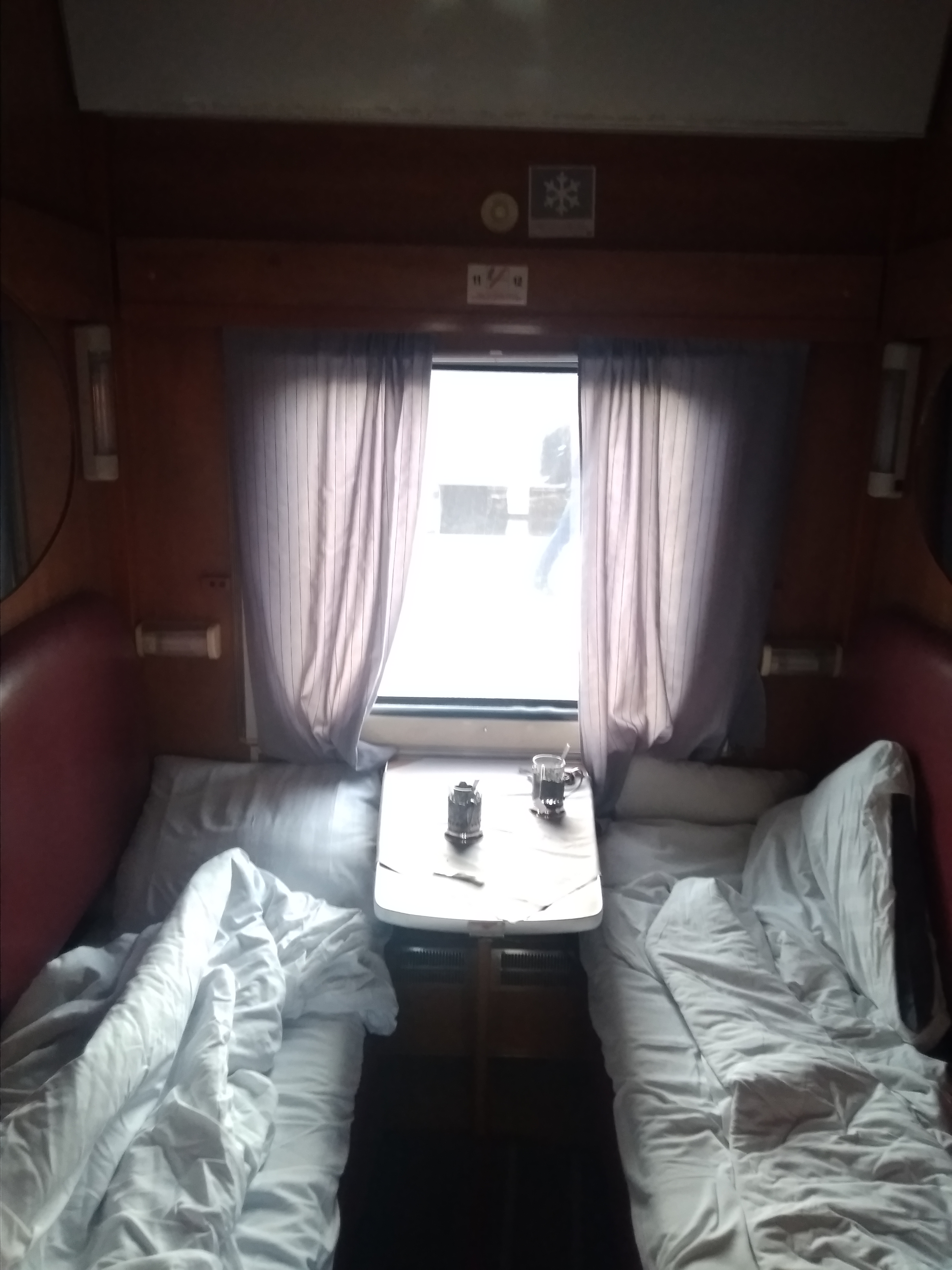 СВ оказался коричневым ТВЗ 2004 года. Довольно уютно внутри. В ходе капремонта матерчатые полки были заменены кожзамом, и это удешевило интерьер, хотя и сделало его более надёжным. Также установили биотуалет.