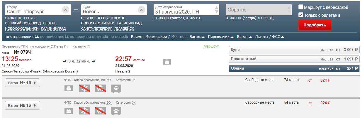 Как интересно! На 31 августа из Петербурга в сабже обнаружено два общих вагона, причем один в купейном исполнении, а второй - в плацкартном. Продажа билетов открыта только до станций, расположенных до Невеля. А дальше вагоны «исчезают».