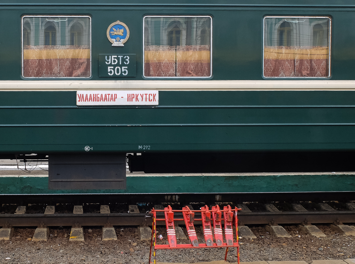 im oberen Bereich der Fenster spiegelt sich das Empfangsgebäude des Bahnhofs. Der Laufweg des Zuges ist ebenfalls angeschrieben: Ulan Bator - Irkutsk. Die Hemmschuhe am Fuß des Wagens runden das Stillleben ab.