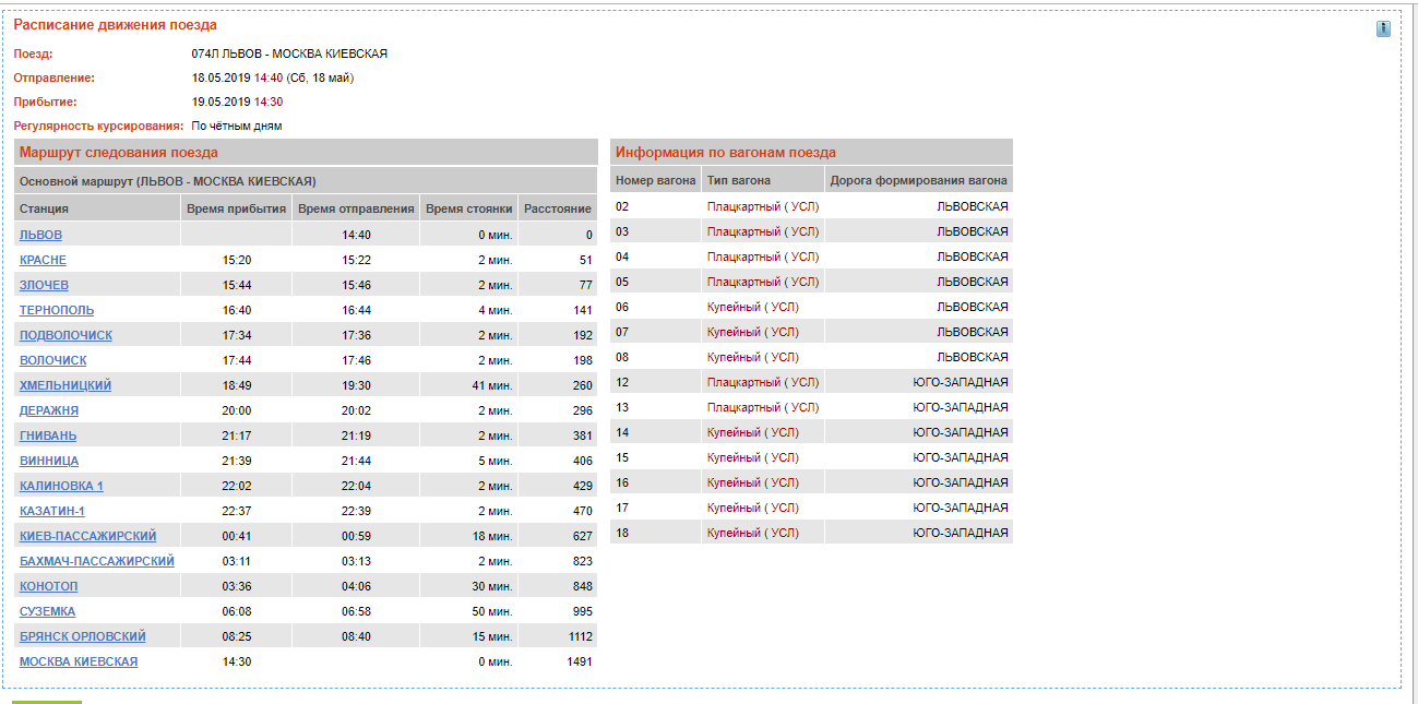 Владимир Дукин » 12-05-2019, 11:59:В итоге с 19 мая имеем отмену поезда 73/74 Москва-Львов с прицепными вагонами до Ковеля в нынешнем виде и поезда 55/56 Москва-Жмеринка-Хмельницкий.