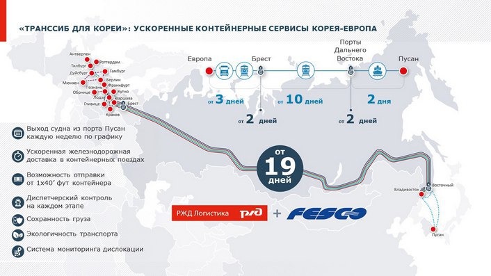 Напомним, что недавно ускоренный транзитный сервис из Кореи в ЕС запустили "РЖД Логистика" и Fesco: порт Пусан - Владивостокский морской торговый порт - Транссиб - Белоруссия - станция "Бжег-Дольны" (Польша). Общее время транспортировки составило 21 день.