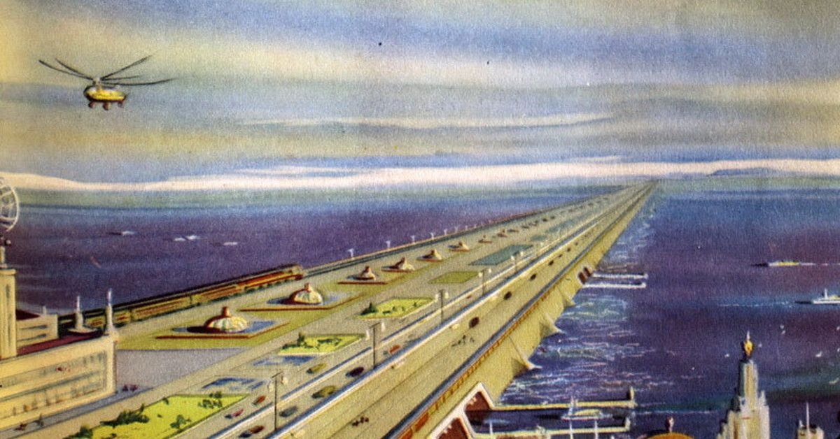 На картине вы можете увидеть проект по соединению двух материков - Евразии и Северной Америки - единой дамбой, который планировался в 60х годах советскими учёными. Проект остался на бумаге, однако, в своё время будоражил умы современников, подробнее тут