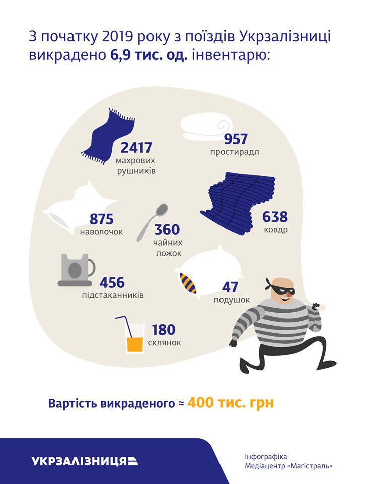 УЗ опубликовала вот эту инфографику. Оказывается, что ни день – то «ложки пропадают». Из поездов выносят всё, что выдают пассажиру. Особенно популярны полотенца, одеяла и наволочки.