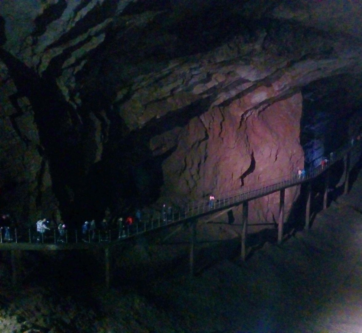 На станции пассажиры покидают поезд и по длинному узкому коридору направляются непосредственно в пещеру