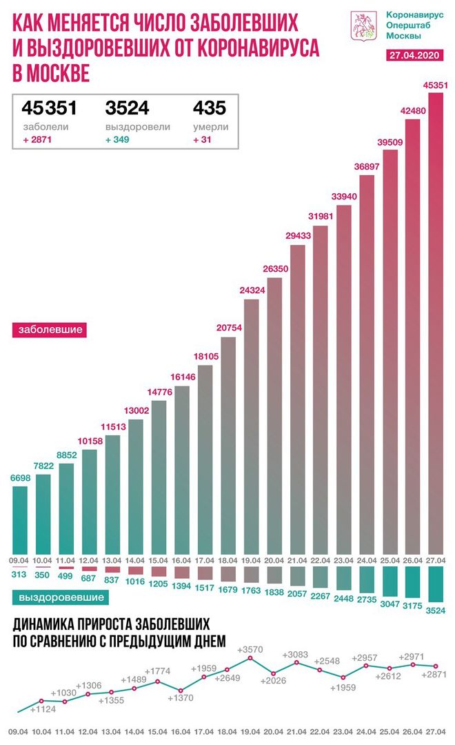 9го апреля болеюших было 6,6к. Средняя продолжительность болезни составляет 2-3 недели. В 20х числах апреля выздоровевших было 3к,умерло от силы пару десятков.