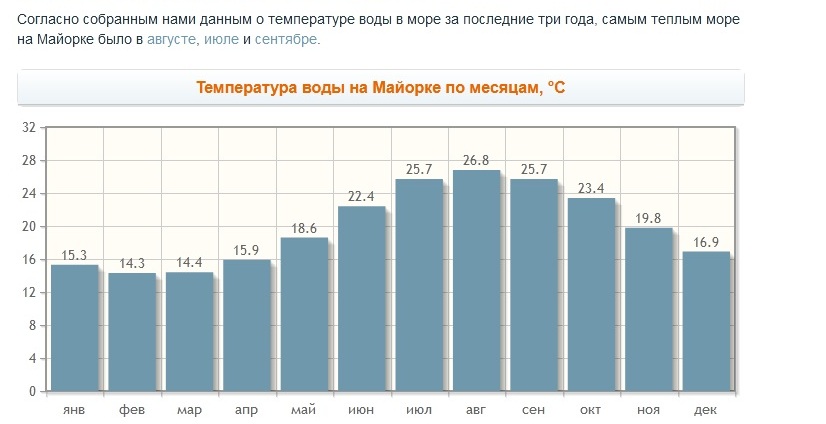Вот, например, данные по температуре воды Майорке по месяцам за последних три года -
