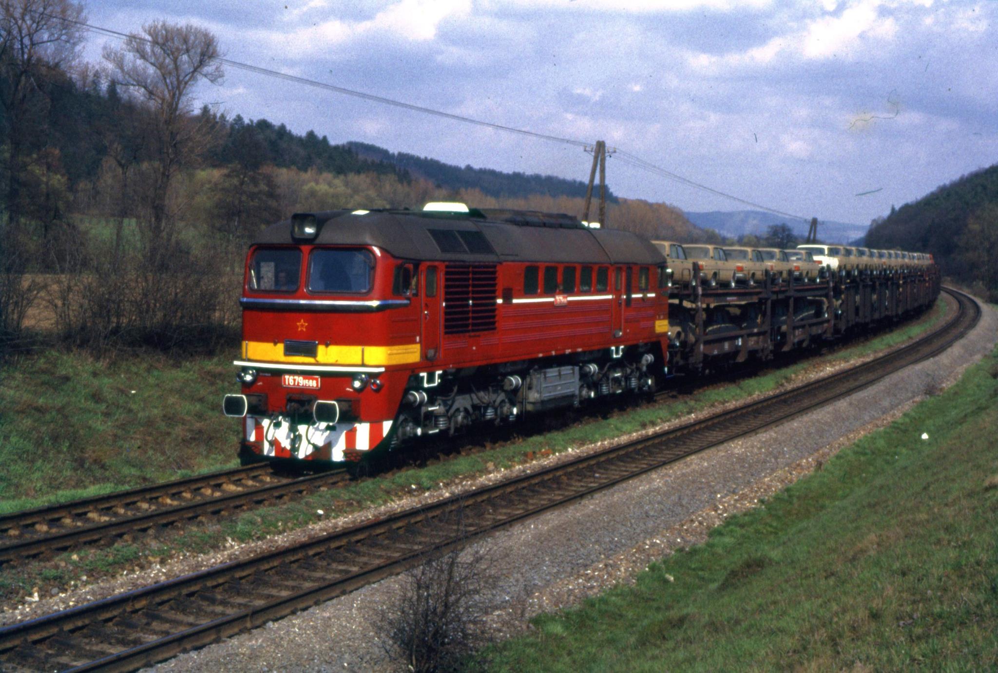T679 1566 s 44108 tehdy s nákladem automobilů LADA určených pro Německo pózuje u vjezdu do Zdic v roce 1984.
