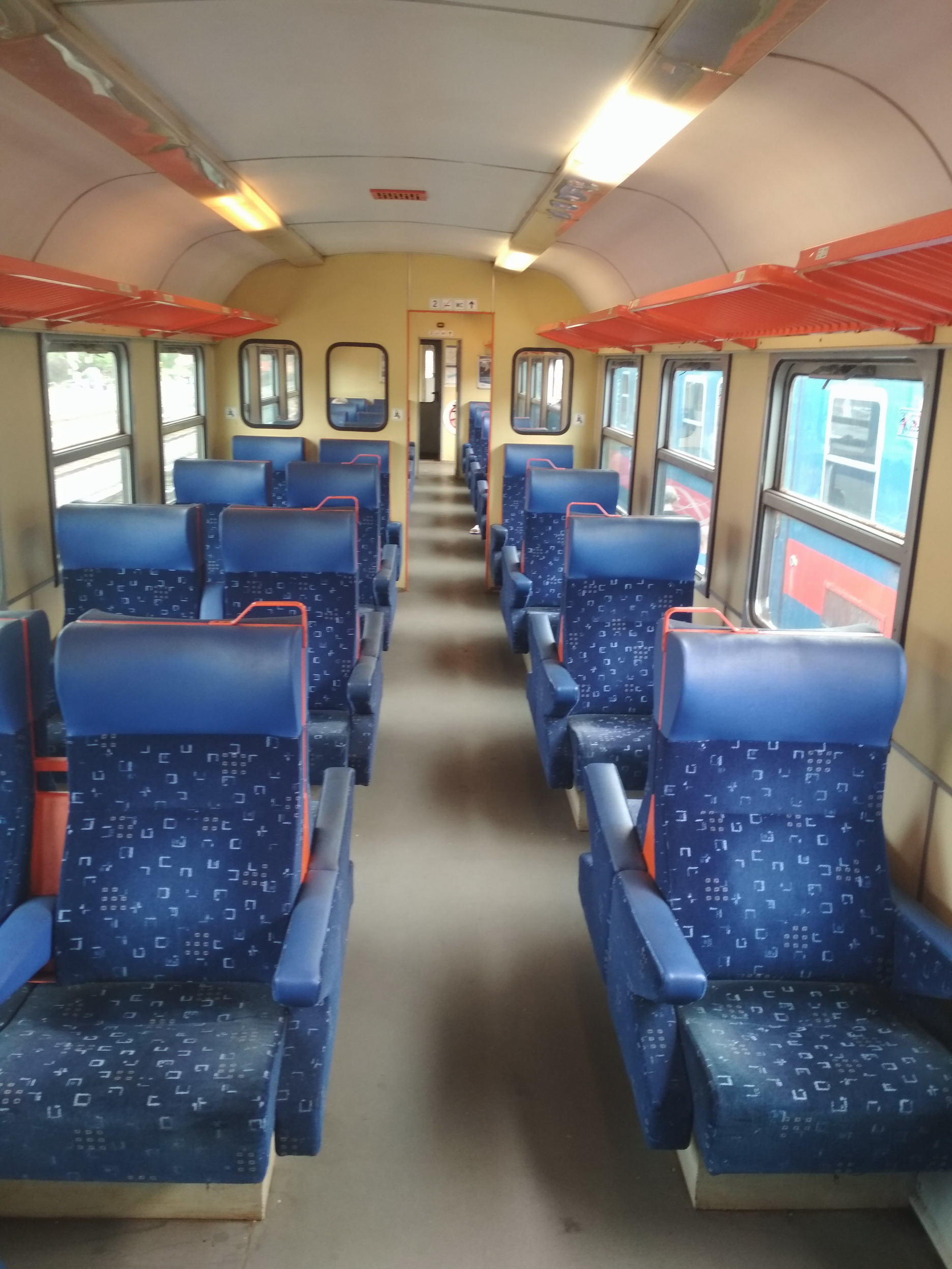 Следующий поезд регионал Захонь 10:03 Ниредьхаза 11:14. После Захони на запад тянется сплошная грузовая станция по перегрузке с 1520 на 1435. Грузовые как Европейские, так и наши РЖДшные. В моем поезде вагоны явно раньше использовались как первый класс, а теперь докатывают свое в регионале. Окна полностью открываются, можно высунутся и проветриться. Поезд потихоньку наполняется, остановок много.