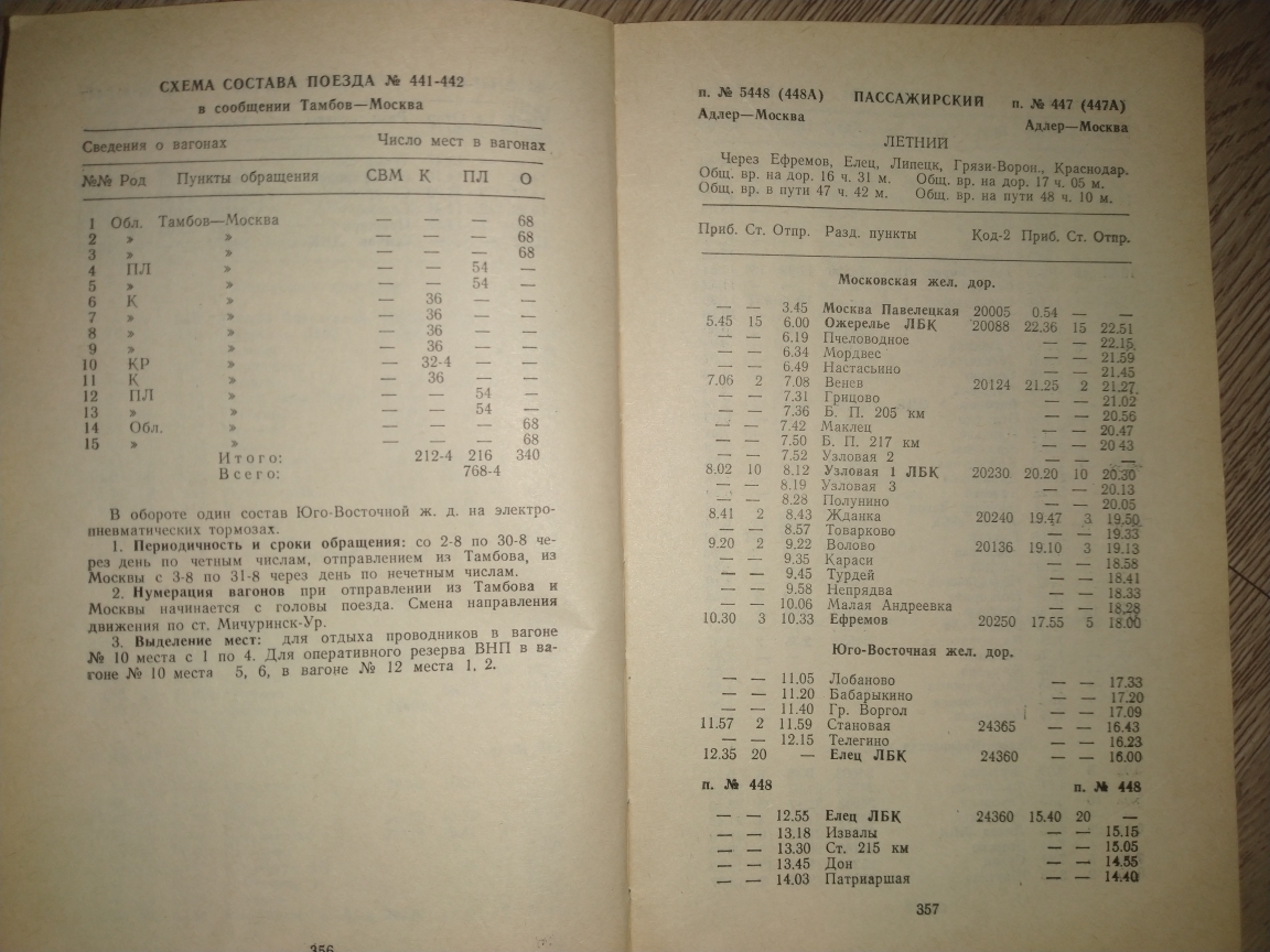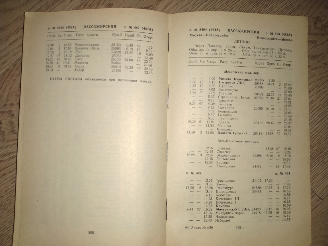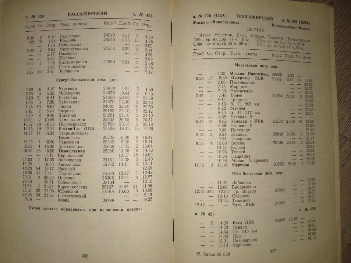 Liski: 419/420 видел как Москва - Орджоникидзе, но мне кажется он шел через Макеево-Московское и не назначался никогда, 425/426 Москва - Новороссийск на самом деле был условно проработан по ЮВжд, на его нитке сидел загон электрички из Мичуринска на ТО-3 или ТР-1 в Отрожку, эта нитка обычно под новый год задействовалась как Москва - Липецк или Москва - Поворино, дальше на юг от Грязей она была всегда занята. Возможно по ней что-то назначалось южнее Воронежа, например, Ростов-Новороссийск. Но мне кажется 419/420 такой же фантом - просто условная нитка по части которой можно назначать всё, что угодно. Как вот был недавно 297/298 Москва - Ростов/Владикавказ и т. д.