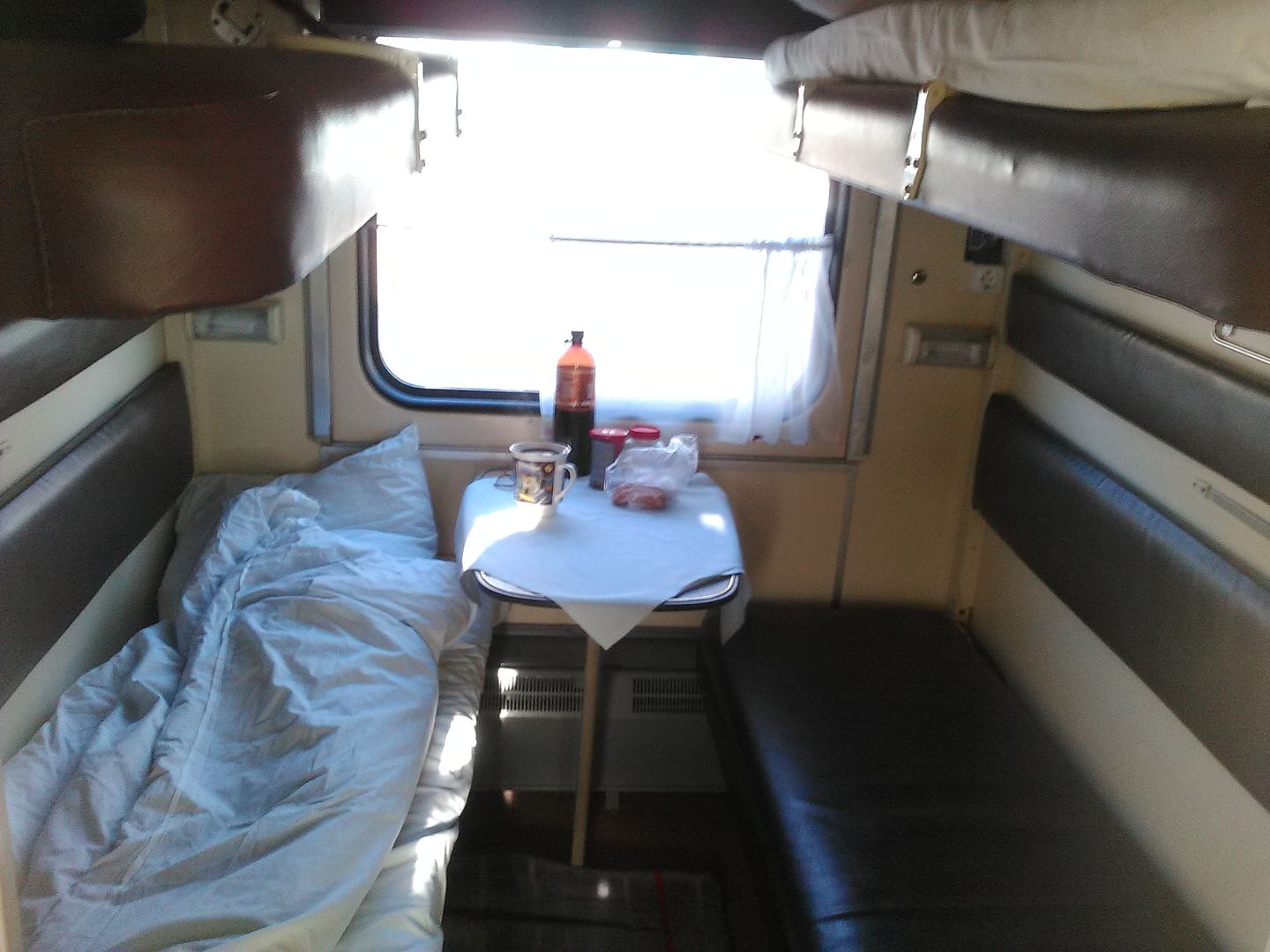 Верхние полки заправлены, одеяло вставлено в пододеяльник, матрасы толстые поролоновые. Я сразу же переложился на нижнее 33-е место (по ходу движения).