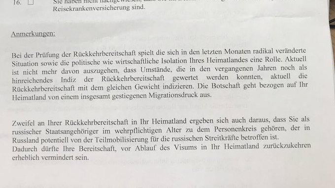 Немцы отказали москвичу в Шенгене (там живет его сестра, постоянно к ней ездит) на основании того, что он подпадает под мобилизацию и может захотеть остаться в Германии.