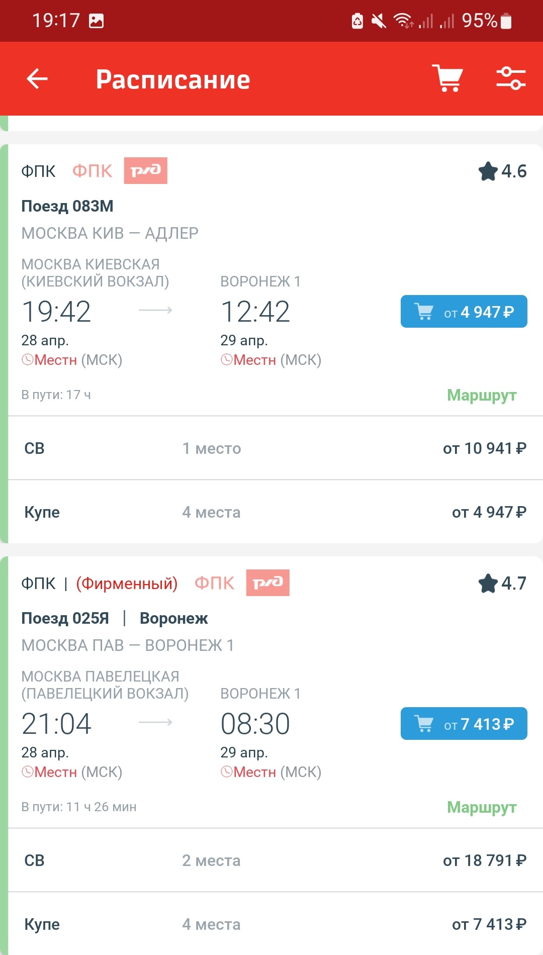 ласточке, что на машине. Про поезда с Киевского и Павелецкого не говорю уже.И 2 места в СВ вывалилось из брони по 18791.Придача:Уже 10700. Все хотят в Воронежv_gildenberg: Вот на сегодня нижнее место в 25 поезде до Воронежа 9 с чем то тысячна Воронежские двухэтажки на понедельник осталось всего несколько мест, при чем как ВРН-МСК, так и обратно