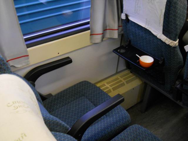 8. Кресла в вагоне удобные, шаг кресел широкий, сидеть удобно, при желании можно свободно вытянуть ноги. Все кресла расположены по схеме 2+2, лицом к середине вагона, часть мест "слепые". В общем, комфорт практически ничем не хуже, чем в Сапсане. Только откидные столики хиленькие, плохо фиксируются в откинутом положении, стаканы в подстаканниках перевешивают.