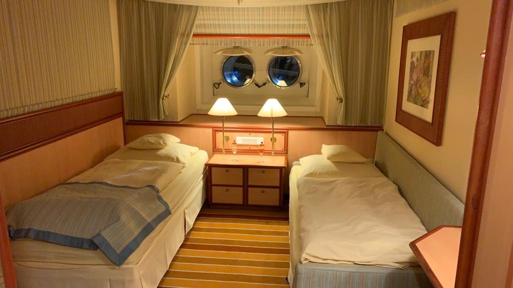 Также на входе угощают забавным велкам-дринком, ну а сама каюта с иллюминатором и расположена в носовой части корабля.