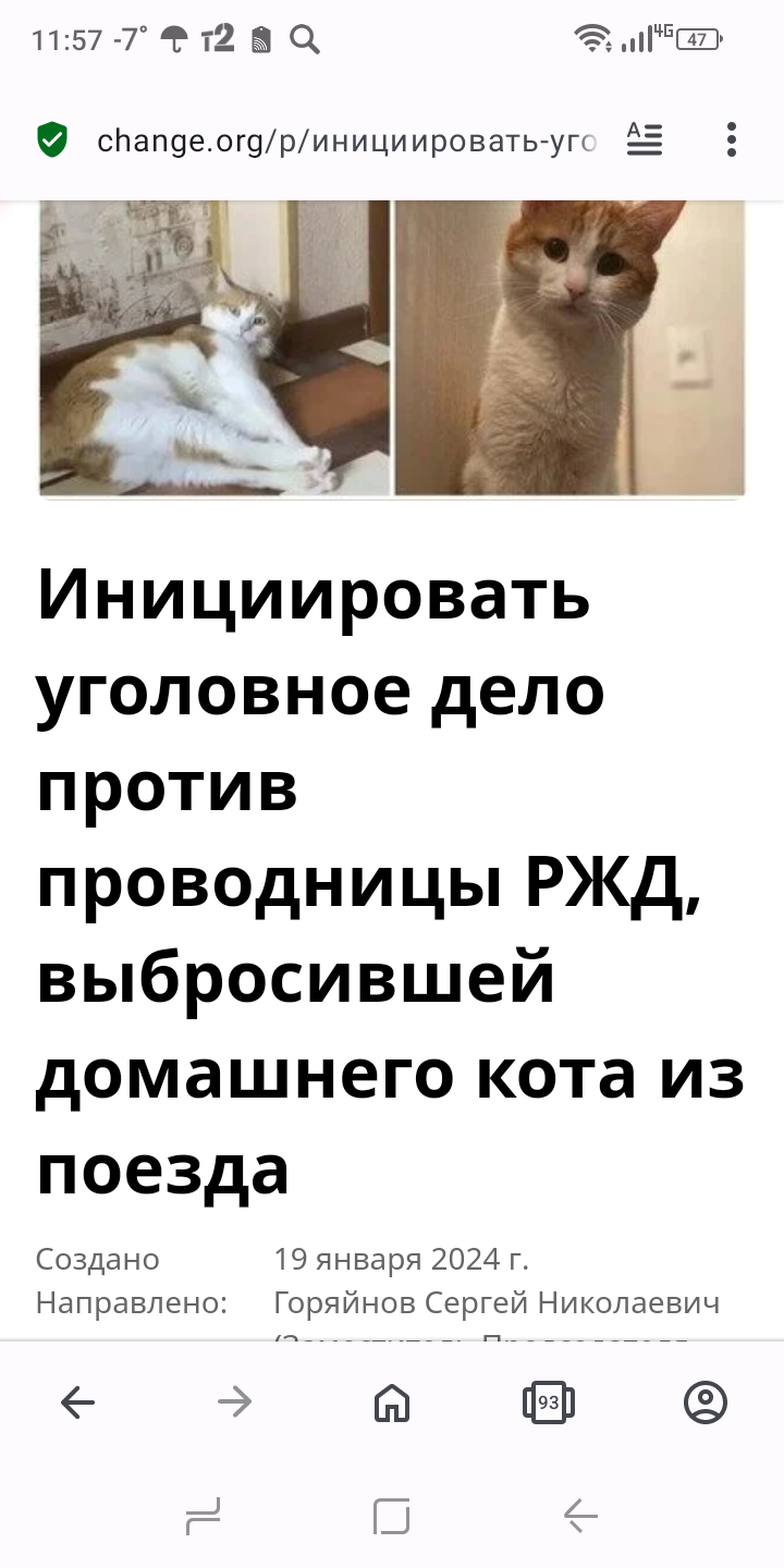 На работе косячить чревато потерей дохода. За кошками слежу, если одна убегает и пропадает, ищем, вплоть до расклейки листовок. Но выгонять кота из вагона на мороз расцениваю как жестокое обращение с животными, а на это в Уголовном кодексе РФ имеется статья. И да, пойду подпишу петицию за увольнение. Дураков надо наказывать.Максим П.: Прежде, чем кого судить, посмотрите на себя. Вы за своим любимцем хорошо смотрите, ответственно? На работе не косячите?