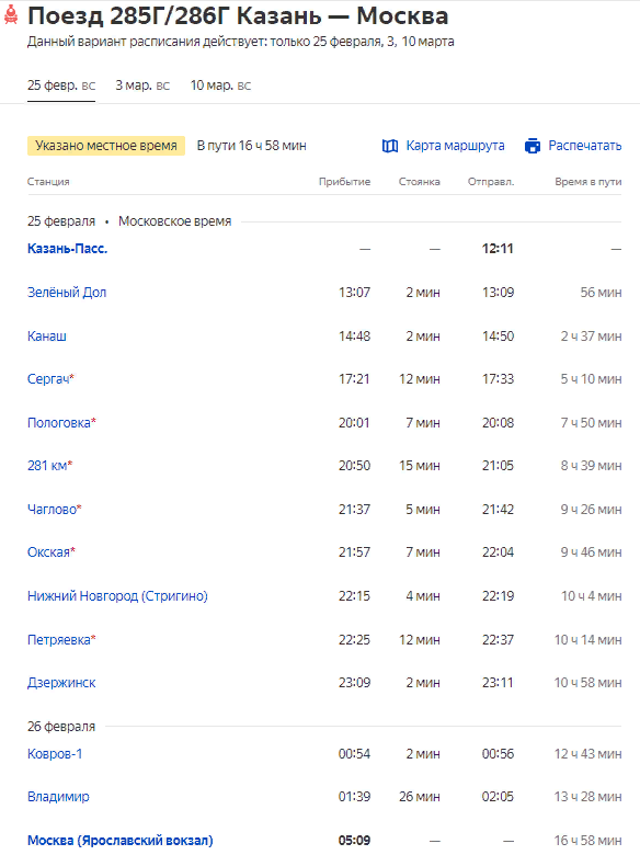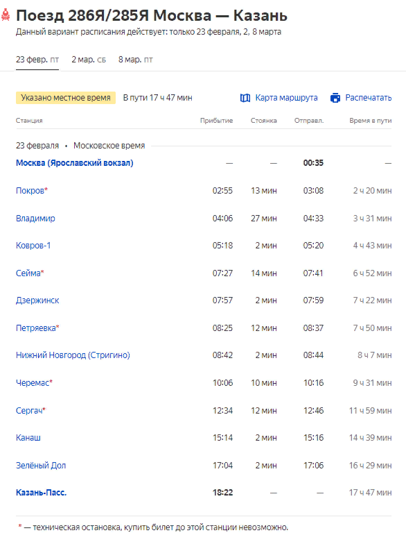 Назначается дополнительный поезд 286/285 Москва-Казань, отправлением из Москвы 23 февраля, 2 и 8 марта; отправлением из Казани - 25 февраля, 3 и 10 марта: