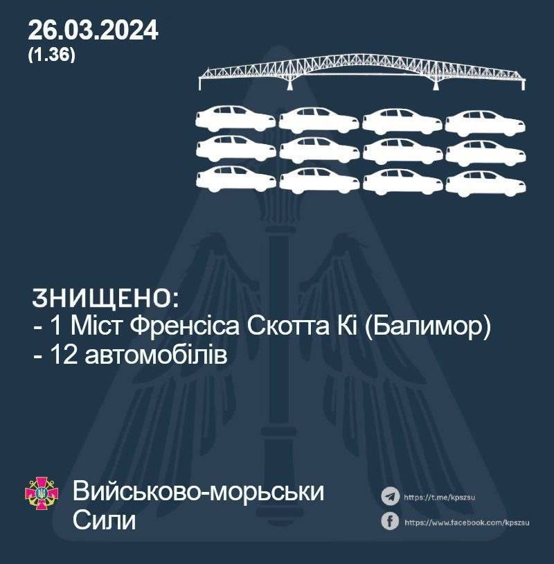 Телеканал Fox Baltimore сообщил, что автомобильный мост Key Bridge имени Фрэнсиса Скотта обрушился в городе Балтимор в американском штате Мэриленд после того, как в него врезалось судно. Движение было перекрыто в обе стороны. По данным радиостанции WTOP, в воду упали несколько автомобилей.