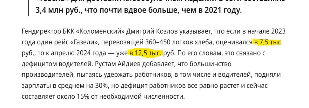 Подорожали Газели. Ок. Подорожала оплата труда. Ок. Для водителей. Конечно это исходники для логистики. Но проблема в том, что кроме цены машины и зп в статье нам рассказали итоговые цифры. А именно: развозка подднов с хлебом стала обходится не в 7,5 тыс.руб, а в 12,5 тыс.руб. Речь, как пишут о 400 поддонах с хлебом в среднем. То есть стоимость доставки в магазин одного поддона с хлебом выросла на 12,5 рублей. А сколько хлеба на этом поддоне - от 10 до 20 штук. ТО есть стоимость доставки готовой продукции выросла (как мы понимаем с уже учтенным лизингом, зарплатой и бензином) от 62,5 копеек до 1,25 рубля. Упс. То есть логистика, для 3х упомянутых выше батонов из Магнита (3 по 350гр равно 1кг) добавит к 120 рублям стоимости килограмма хлеба еще максимум 3,7 рубля. Ну то есть около 3% за год. Плохо, но не впечатляет.