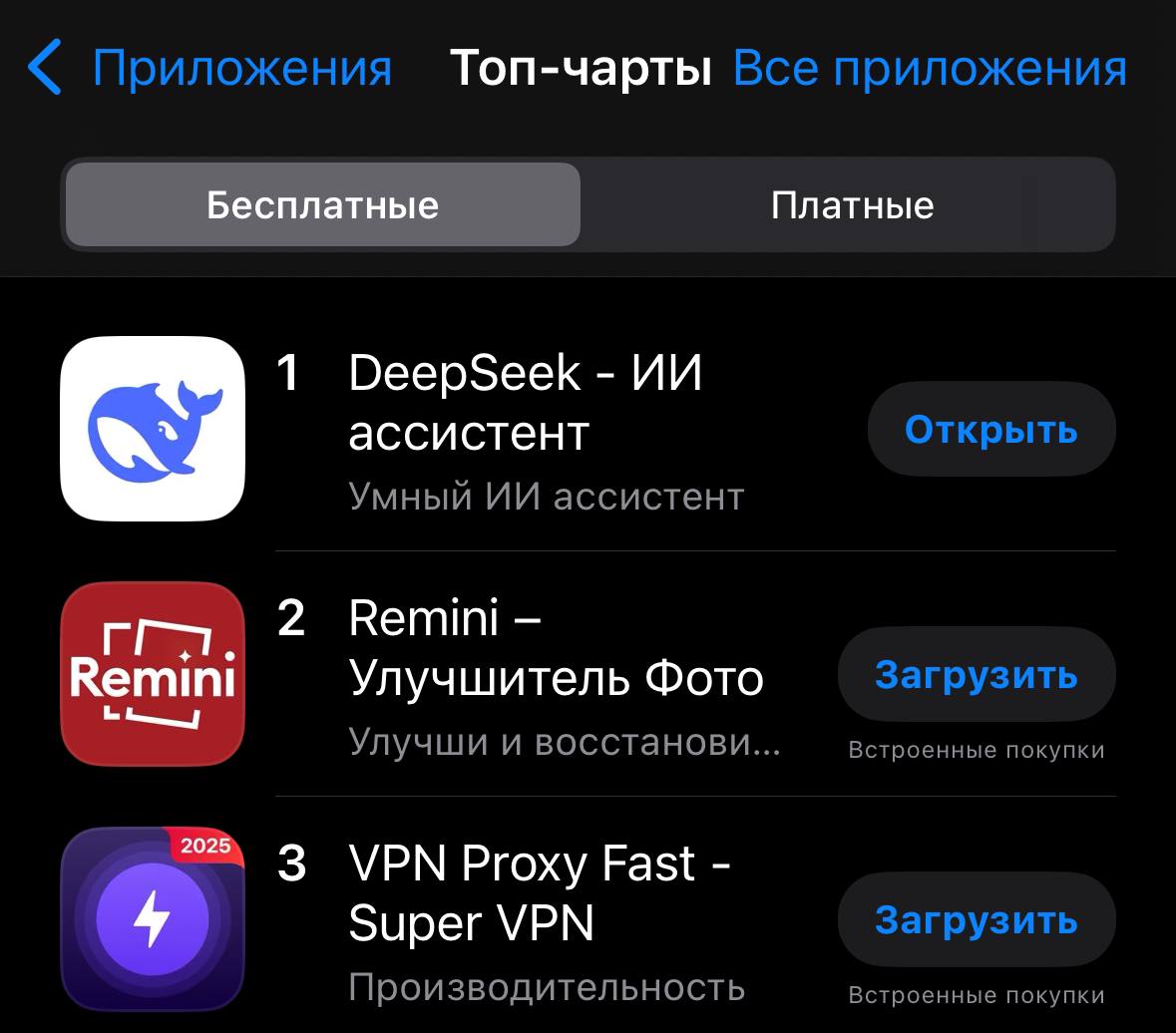 Как и ожидалось, китайский чат-бот DeepSeek возглавил российский топ наиболее популярных приложений в App Store. В Google Play приложение вошло в топ-20, хотя за день до этого занимало 115-е место.
