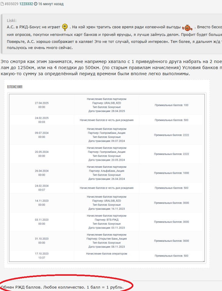 покупали если кому не хватало немного до бесплатного билета, и покупали когда за баллы было выгоднее ехать чем за деньги (012 Мичуринск-Анапа, 030 Мичуринск-Новоросийск, 035 Санкт Петербург-Сочи, 031 или 009 Тамбов-Москва , сейчас после изменений наверно будет не актуально уже. Сотру подпись.seregathebest:Это на Сапсан за 10к. Неужели кто-то покупает?1223332 » 12-08-2025, 22:20:Это смотря как этим заниматся![]()