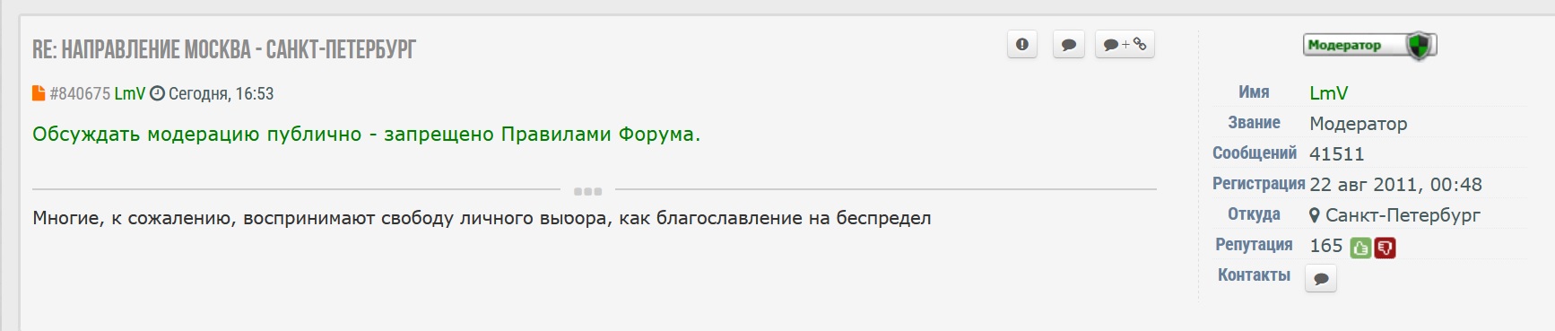 В течения дня наблюдал за темой "Направление Москва - Санкт-Петербург" https://rail-club.ru/forum/viewtopic.ph ... start=4605, вступать в дискуссию и отвечать было некогда, но оставил одно сообщение, в поддержку комика и посетовав, что информация от знатоков и профессионалов, располагающих информацией - на форуме более неинтересна. Позднее обнаружил, что мое сообщение исчезло, видимо, было "отмодерировано".