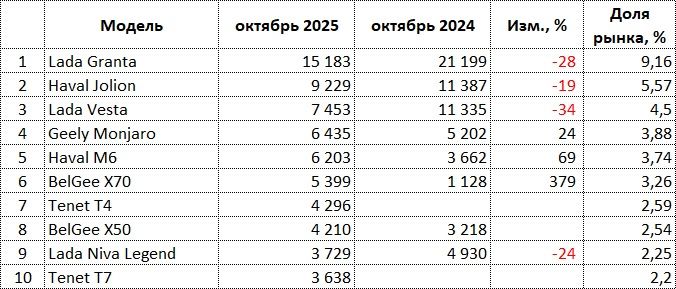 В октябре 2025 года в России было продано 165 702 новых легковых автомобилей, что всего на 3% меньше, чем годом ранее.