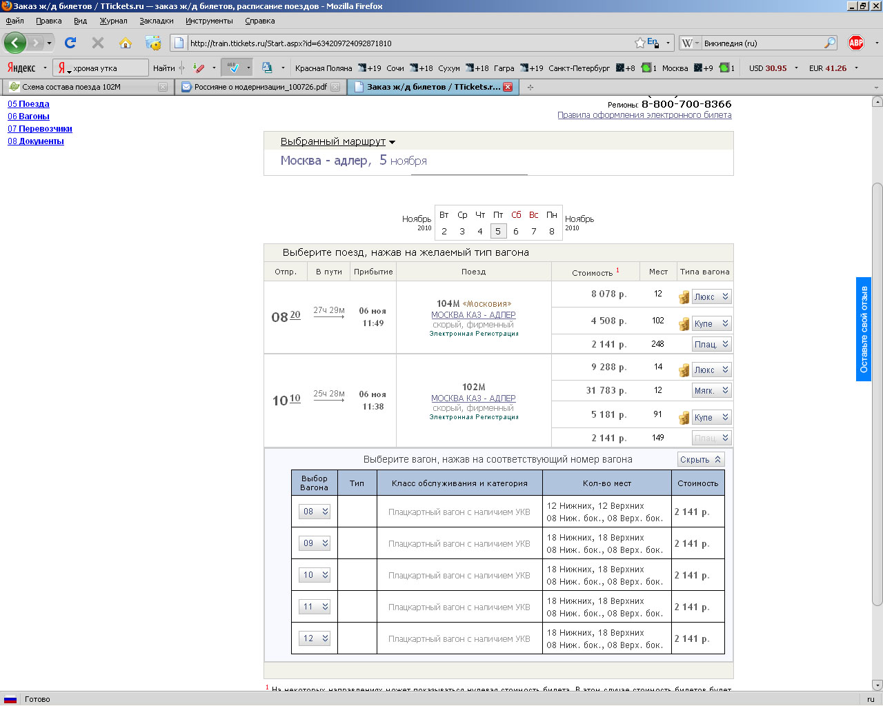 Куда смотреть? Справка по схеме на настоящем сайте кажет штатные 12П, 13П и 14П (на некоторые дни нет 14П), на некоторые дни нет также одного вагона ЛБ, остальное - купе. Просмотрел отрезок 01 - 07 ноября.Slon:Что-то я смотрю, в ноябре 102-му кардинально перекраивают схему - плацкарты начинаются аж с 8 вагона. У кого есть желание и время, можно покопаться.