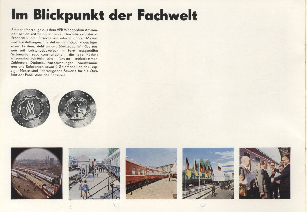 Народное предприятие Вагоностроительный завод "Аммендорф" (VEB Waggonbau Ammendorf) выпускал в свое время буклеты о производимой продукции. Предполагаю, что немногие знакомы с содержанием данных материалов, и их размещение на форуме представит определенный интерес аудитории, в особенности, знакомой с немецким языком. В любом случае можно довольствоваться просмотром фотографического материала.