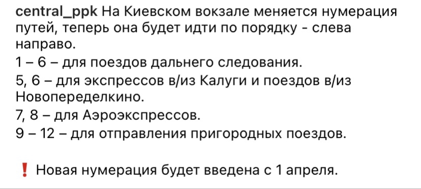 С 1 апреля меняется нумерация путей на Киевском вокзале Москвы