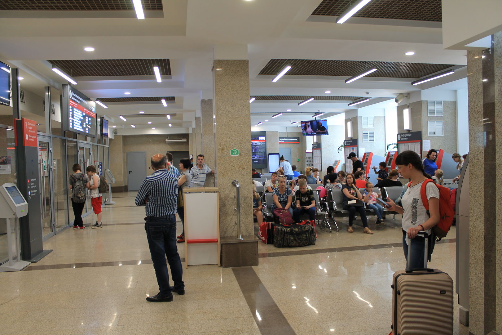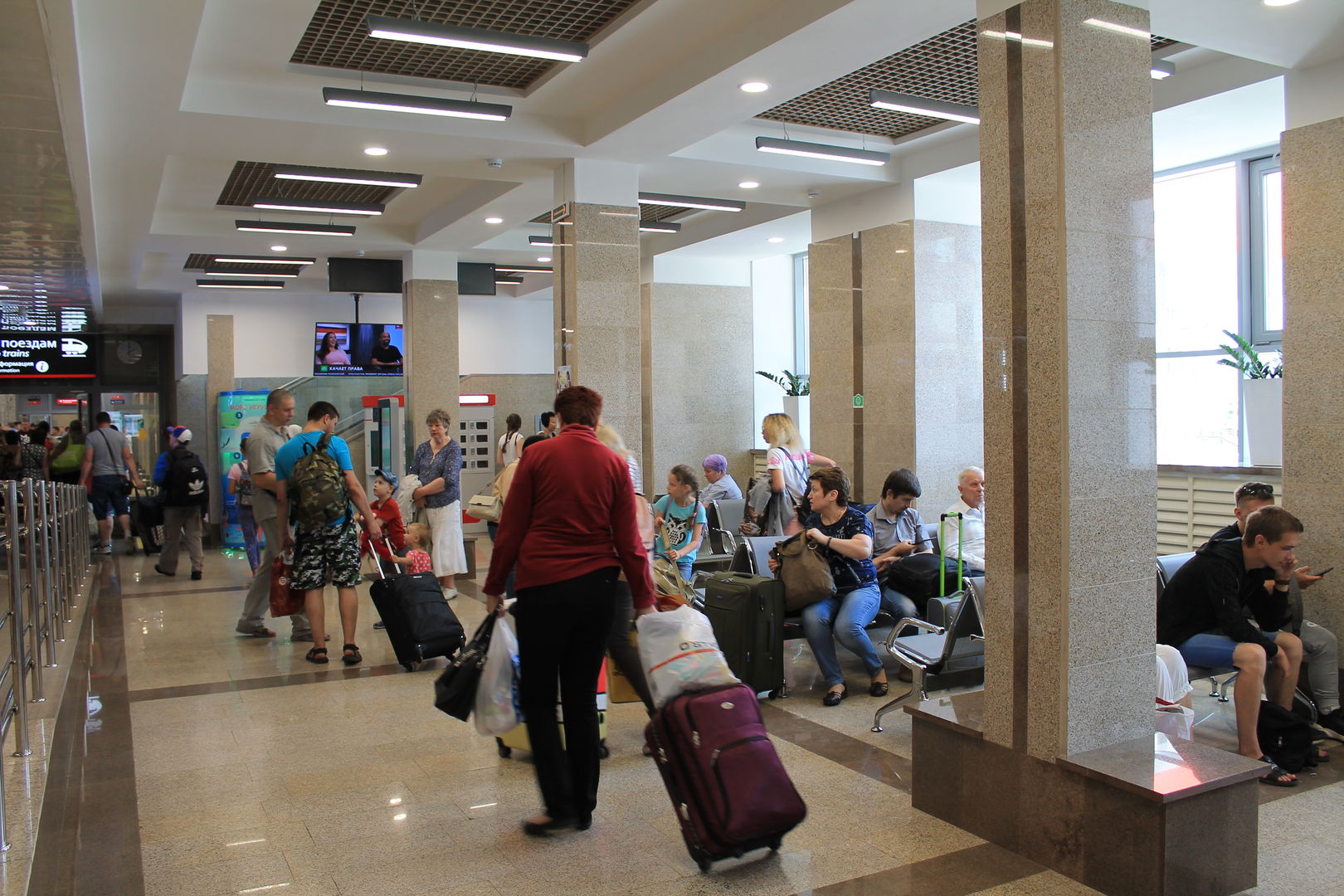 Полность согласна. Ничего не изменилось. грязное душное место. Эта уродская конструкция сверху-прям как "домоклов меч",того и гляди рухнет. Мало того что не вписывается в интерьер, она его просто уродует. Вместо неё поставили бы кондиционеры- вокзалишко -то маленький. А та конструкция что снизу, вообще не понятно для каких целей там поставленная, занимает почти треть площади вокзала. "Приткнуться" негде, места в зале ожидания платные, а те немногие(по моему пять рядов по пять кресел) заняты более шустрыми и молодыми. Приспособлений для подъёма багажа нет, даже элементарных горочек, только, правильно Вы заметили , абсолютно не фунциональные рельсы. В общем - "медвежуть!!!" ::-!: