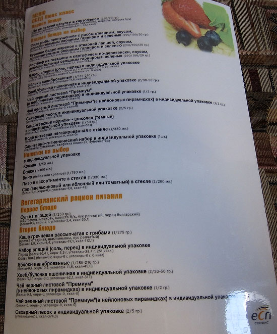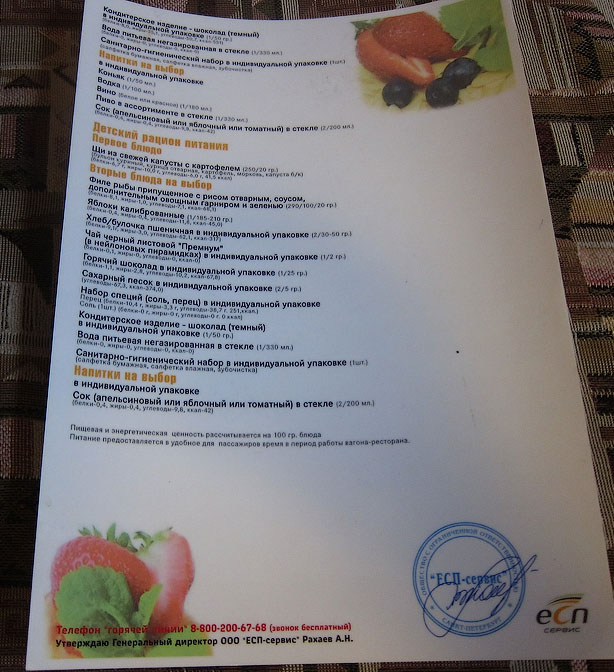 Официальное меню ЕСП-сервиса для вагонов класса "люкс" в поезде 102: