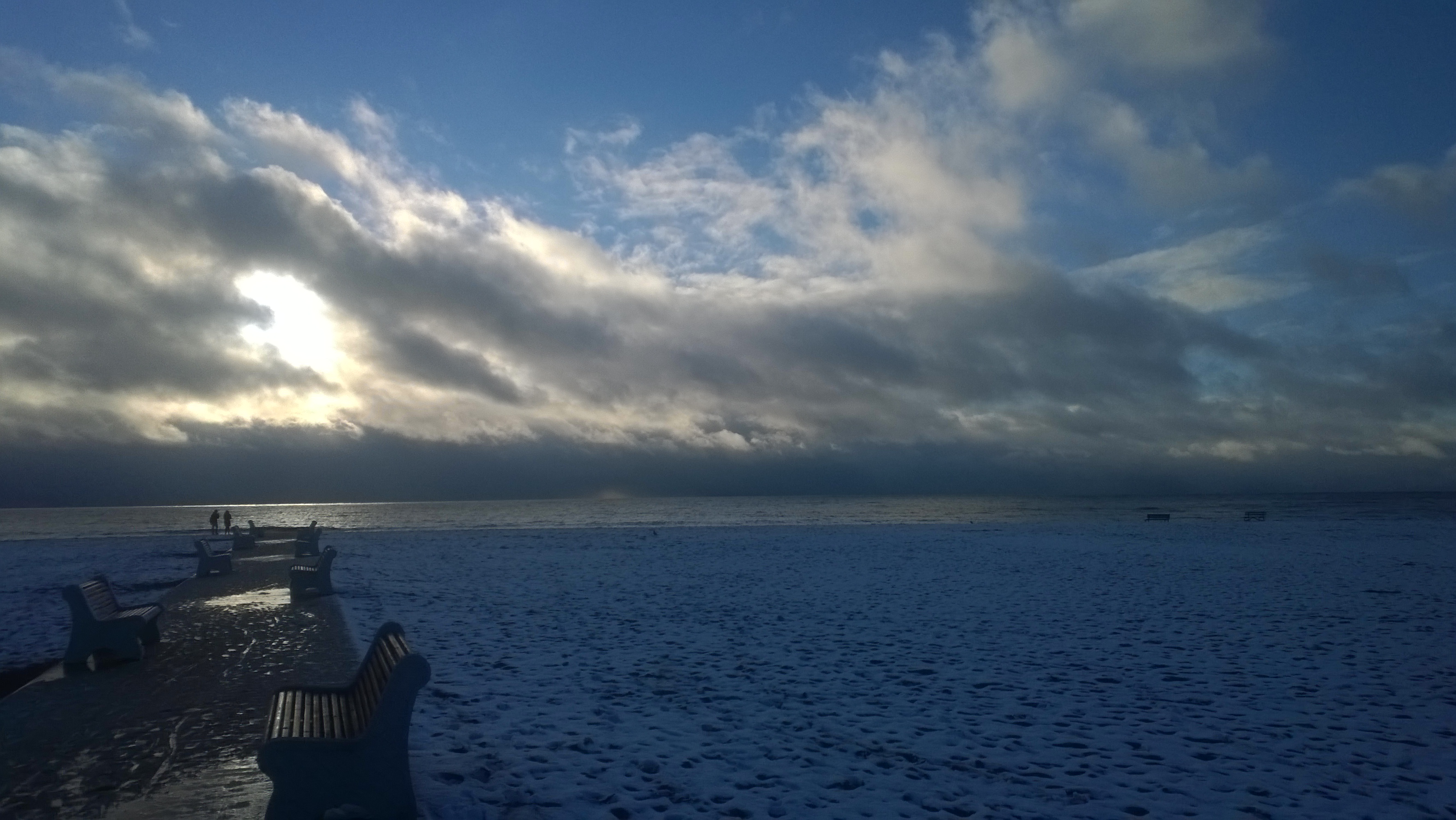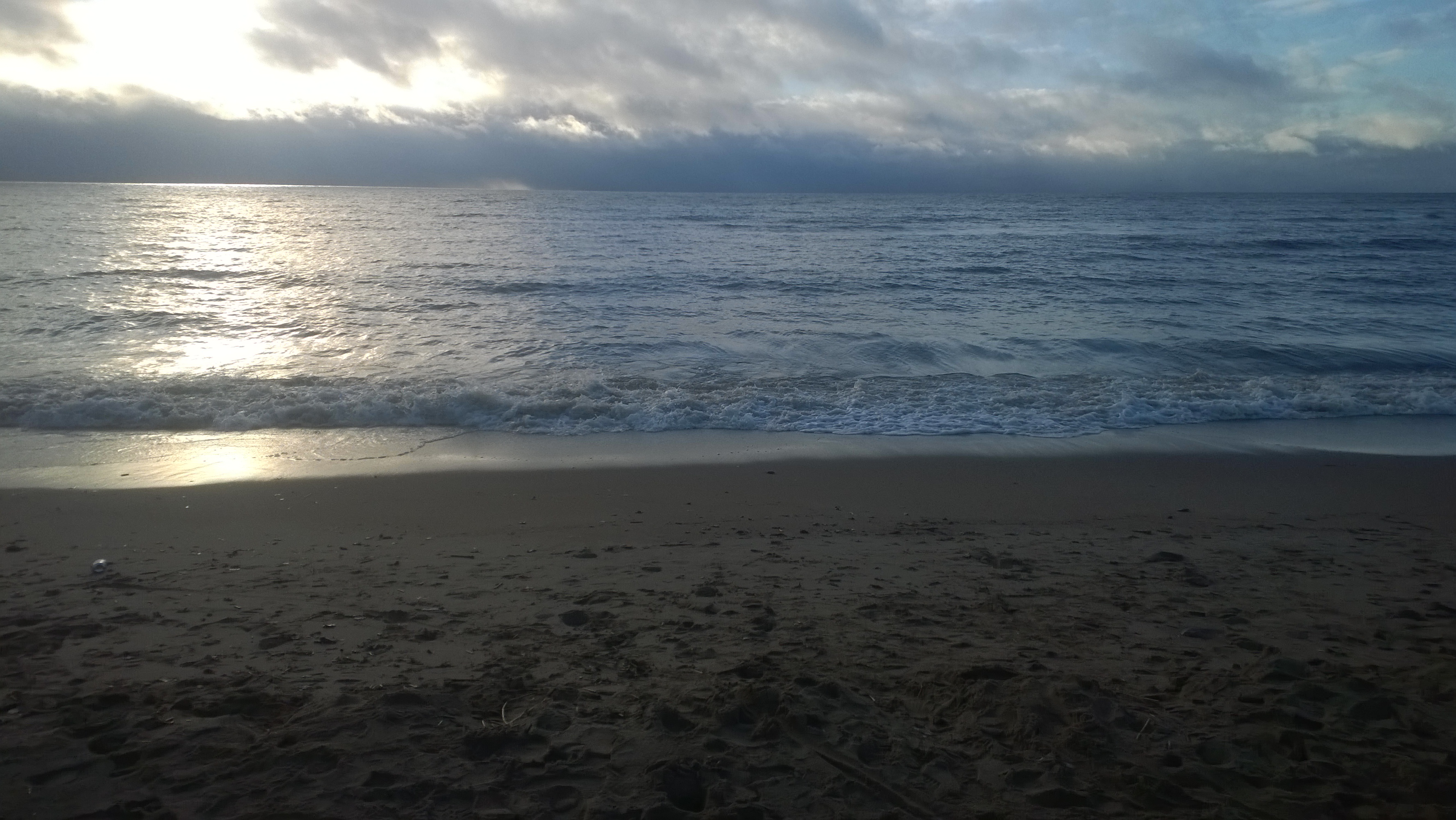 Вода в заливе (по чистоте) имхо приемлема для купания. Не удержался и даже попробовал на вкус ::-D: - совсем слегка солоноватая. У берега мы были минут 20, за это время погода сменялась часто - солнце то выглядывало, то опять скрывалось за многочисленными облаками над горизонтом... По берегу рассыпаны ракушки - честно говоря, всё это было весьма непривычно видеть в ноябре, потому что в своей жизне до этого я видел только летнее море.