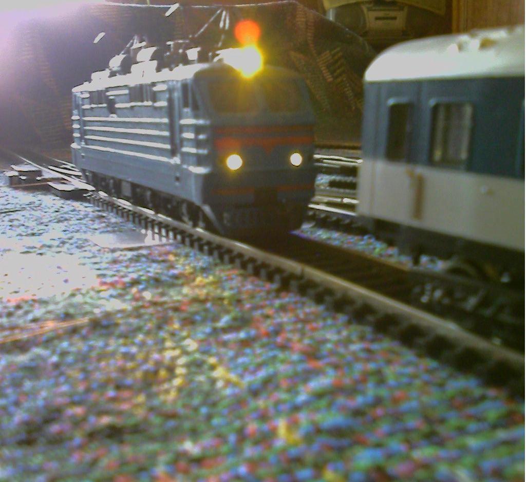 Минуть через двадцать, мы услышали работу сигнализации на переезде. Несмотря на некоторую неохоту оторваться от мягкой подстилки, мы с интересом выходим к железнодорожным путям. Сквозь ослепляющие солнечные лучи, видим, как к нам стремительно приближается состав из пассажирских вагонов, подавая протяжный гудок. В его голове - хорошо узнаваемый нами, обитателями Южной дороги, электровоз. Несколько секунд, и мимо нас проносится пассажирский поезд, ведомый электровозом ВЛ82м.