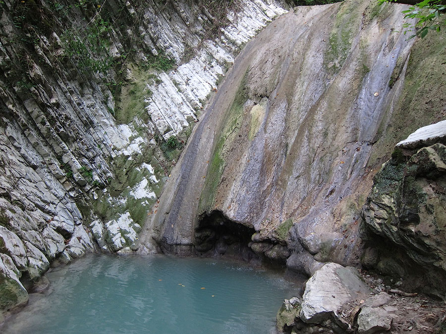 По всей высоте водопада река вымыла в каменном ложе три углубления-чаши: