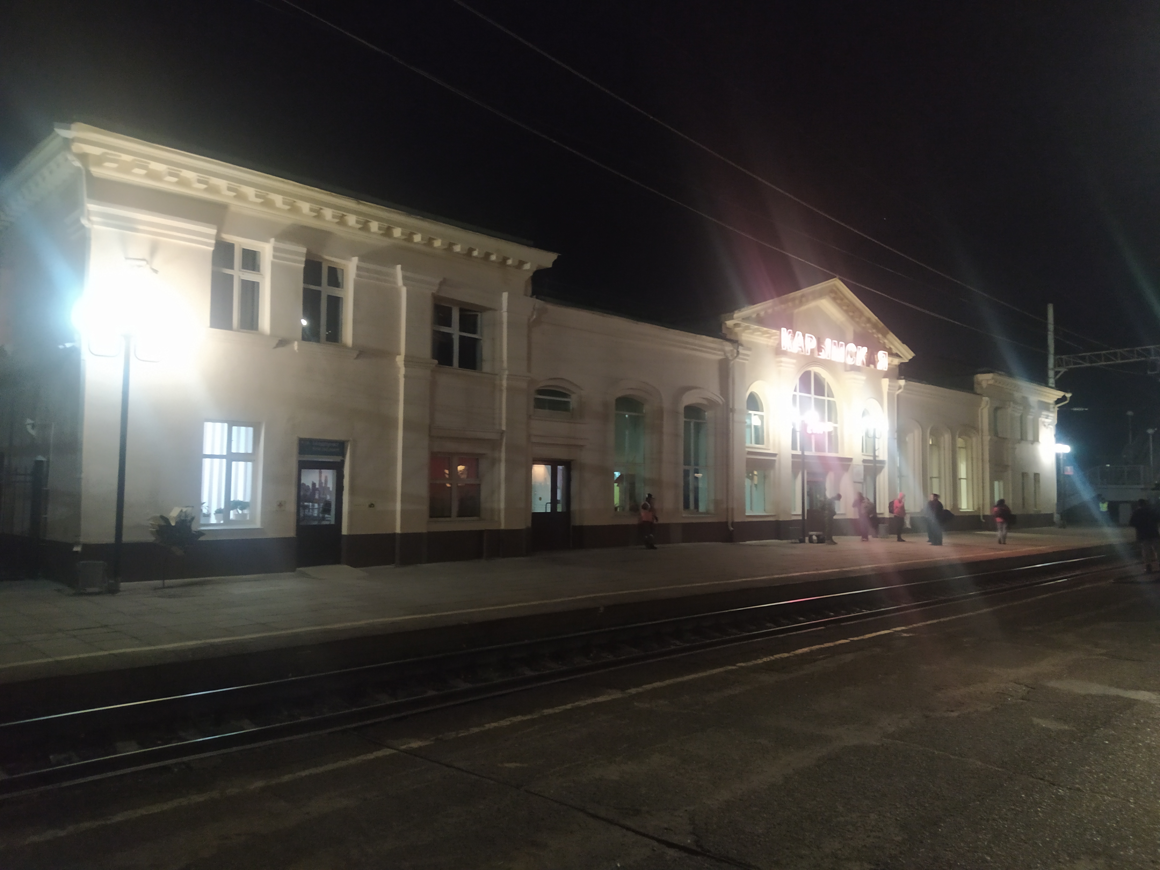 Карымская. 5 минут опоздания. Есть по составу небольшие высадка и посадка.