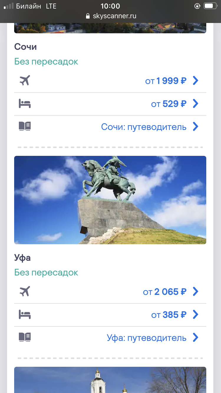 v_gildenberg: Я даже такую историю расскажу . Я из Краснодара набирал и набирал Москву. И цена от 8000 рублей начинается . Ну это тоже много. Потом набрал : поиск по всем направлениям . Смотрю азимут в Калугу за 3100. Ого! Нормально ! Пока деньги на секретный счёт переводил (чтоб в интернете не обманули) цена до 1100 упала ! :=-O: было в 9 утра 3100; в 11 утра уже 1100