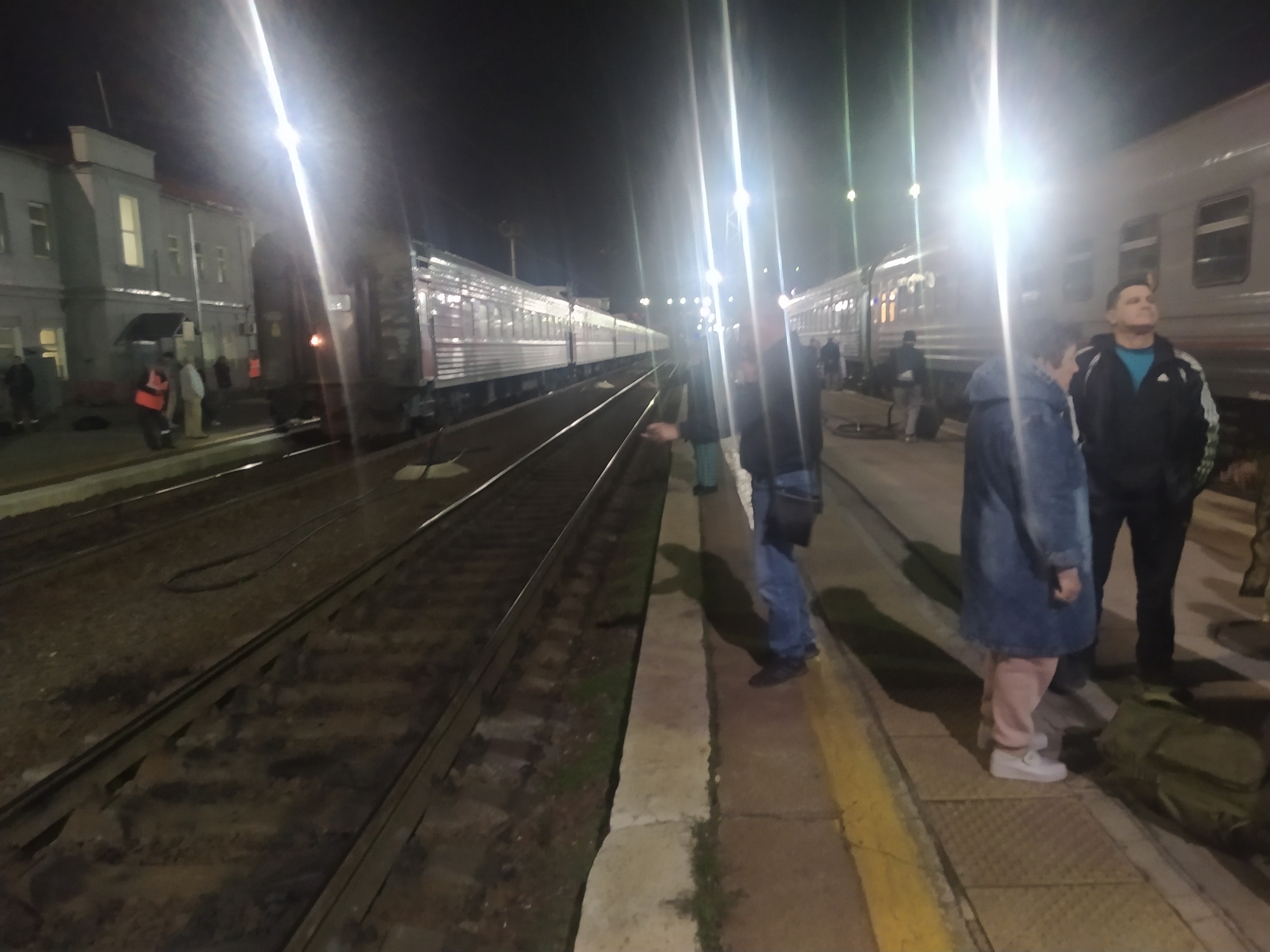 Приняли на 1-ю платформу, где 7 и 8 вагоны встали на стрелке. Нашему тоже не хватило платформы, но ладно, что в этом месте есть настилы, и не пришлось выходить через другой вагон.